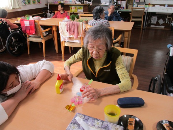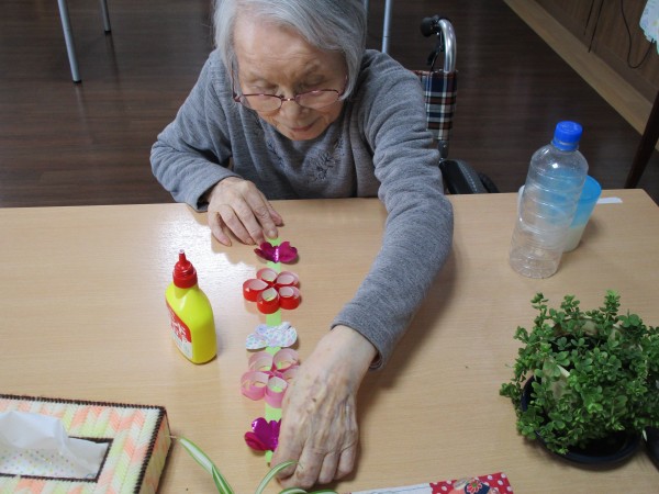 先日、春らしい梅の吊るし飾りを制作するレクリエーションを行いました(^^♪