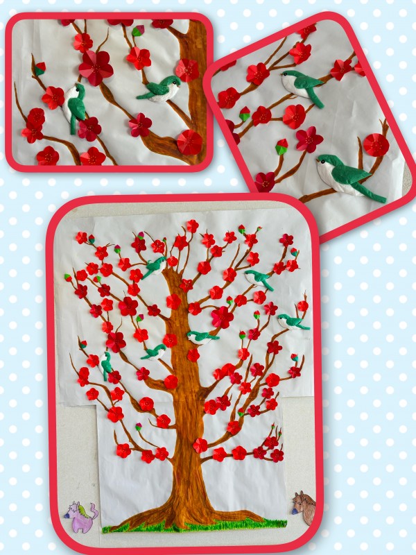 まずは鮮やかな紅梅が咲きましたよ。同じ赤色でも微妙な違いがあり、花の大きさも様々。バランスを考えながら貼ってくださいました。