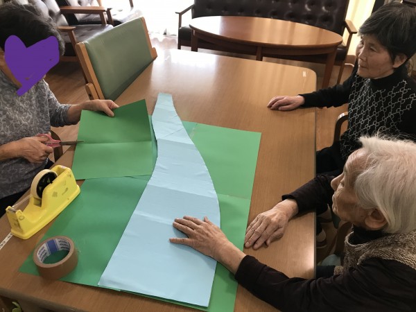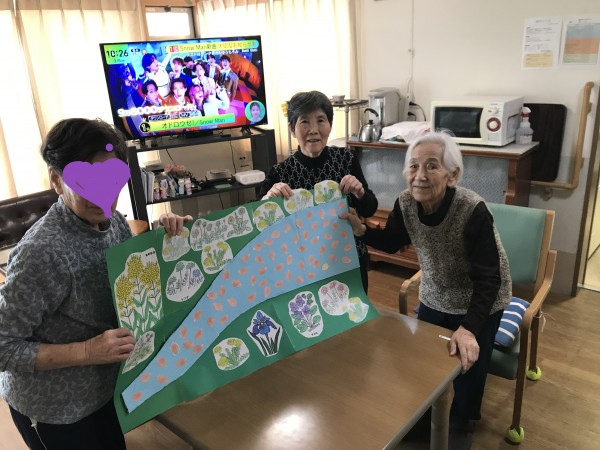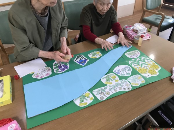 春が待ち遠しい季節になってきました。本日は「花」(民謡)を歌いながら、皆で川を作り、お花もたくさん作りました!