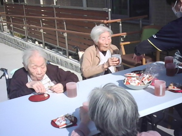 天気のいい日の外気浴で1階、2階合同でお茶会を行いました