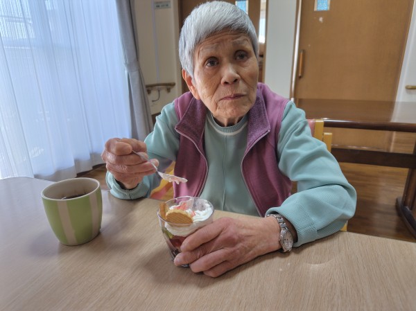 職員がパフェを皆様の前で調理し、皆様早く食べたそうに眺めて