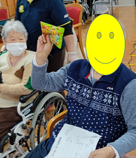 続いてはお宝お渡しゲームです。皆さんが歌っている間に順番にお宝が入った箱を隣の人に渡していきます。歌が終わった時に箱を持っていた人が中のお宝を手に入れることができます。