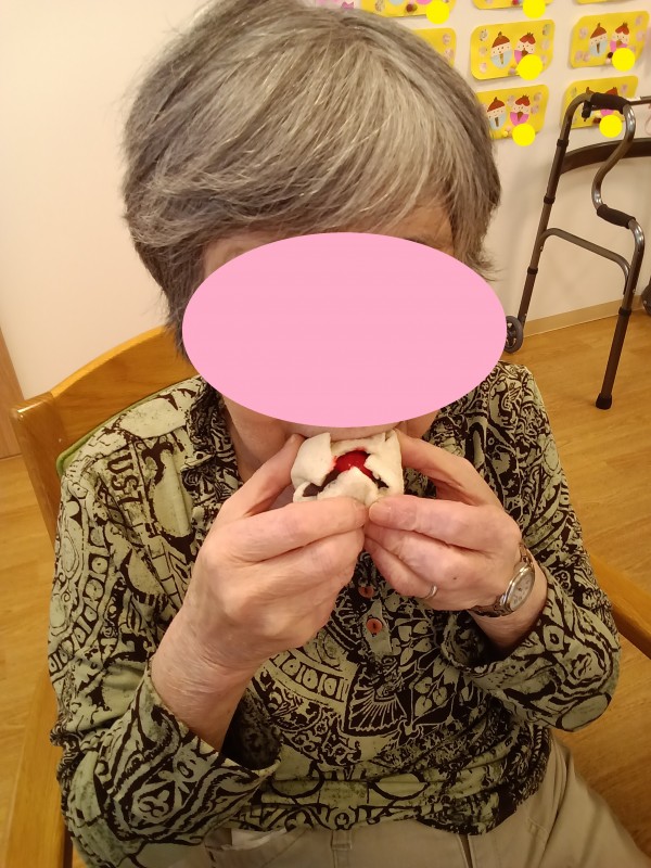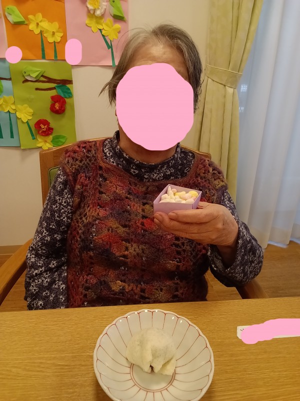 雛祭りおやつは雛あられを「なつかしいわ~」「美味しい」と召し上がっていました。パン大福も旬の苺がすごく甘く大満足のおやつでした(^^♪