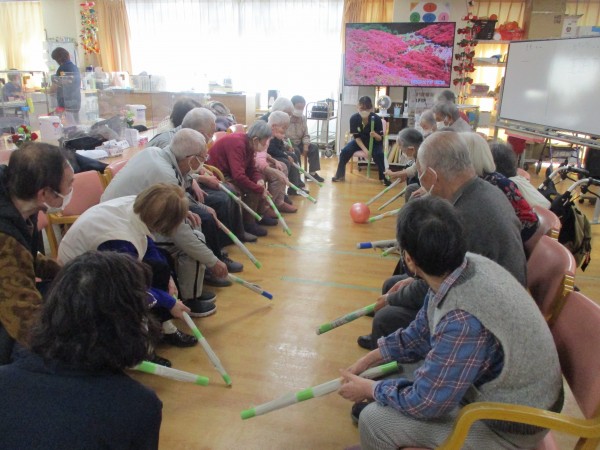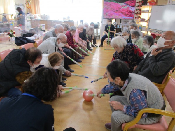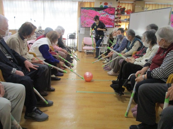 本日午後のレクリエーションは、大人気の「棒サッカーゲーム」を行いました。回を重ねるごとに皆様の動きもどんどん上達し、今回もスタートから大盛り上がり!「いけー!」「そこだ!」「こっち!こっち!」掛け声や応援の声が飛び交い、フロアは熱気に包まれました。