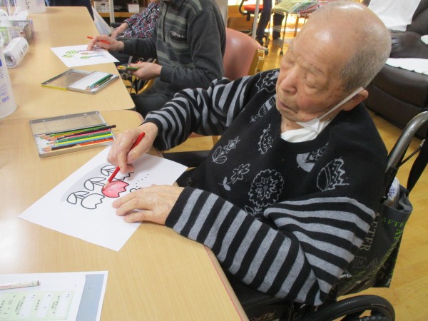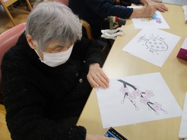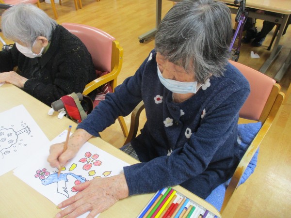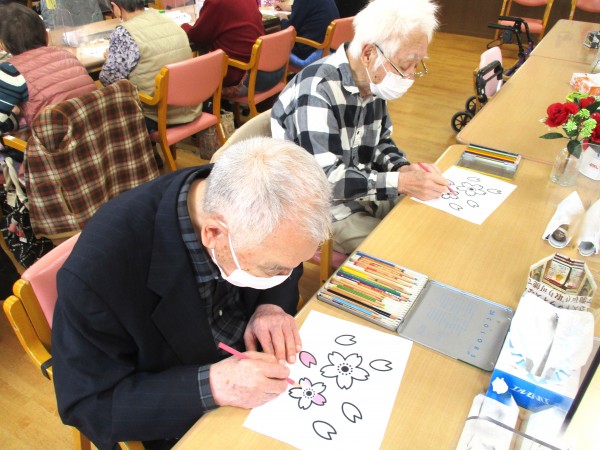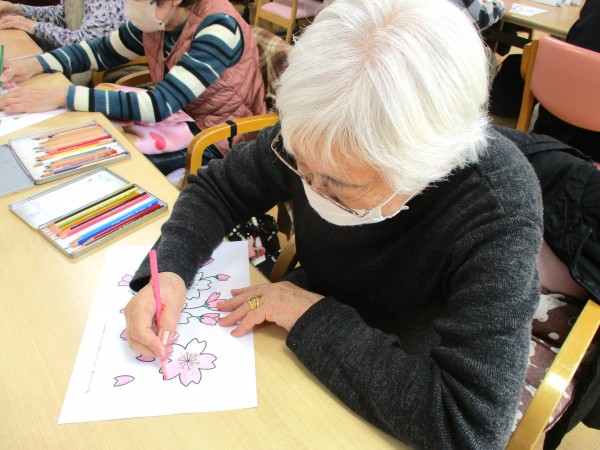 塗り絵では、桜やチューリップなど春らしい絵柄をご用意。「この色がいいかな?」「春らしく明るくしよう」と、皆様それぞれに色合いを考えながら、丁寧に仕上げていらっしゃいました。同じ図柄でも、使う色によって雰囲気が変わるのが塗り絵の魅力。完成した作品はどれも個性豊かで、見ているだけで春の温かさを感じられます。