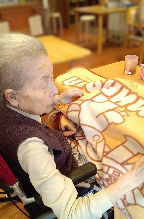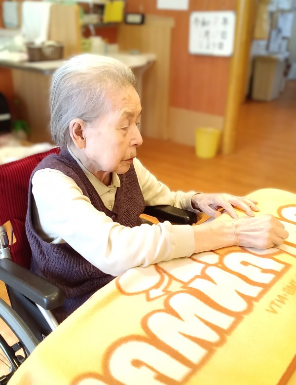 ひざ掛けを机に広げ 何やら作業をされているH様…
