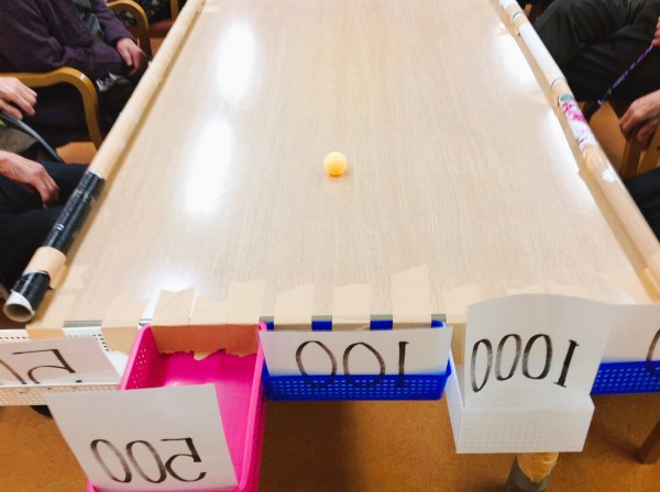 テーブル3つ繋げて、先の方に5つの籠があります。ピンポン玉6つを転がして、入った籠の得点がゲットできます。