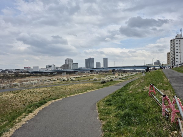 多摩川沿いにでました。こちら正面をまっすぐ行くと川崎へ、