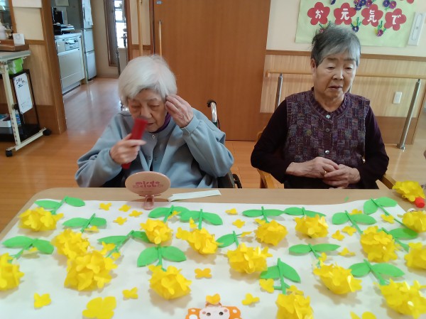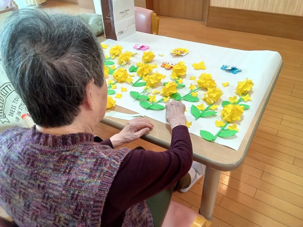 スタッフがお花紙と折り紙を使い、春の代表花である菜の花のパーツを準備。