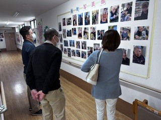 施設内に掲示してあるご入居者様のお写真や壁面の作品を紹介している様子です。