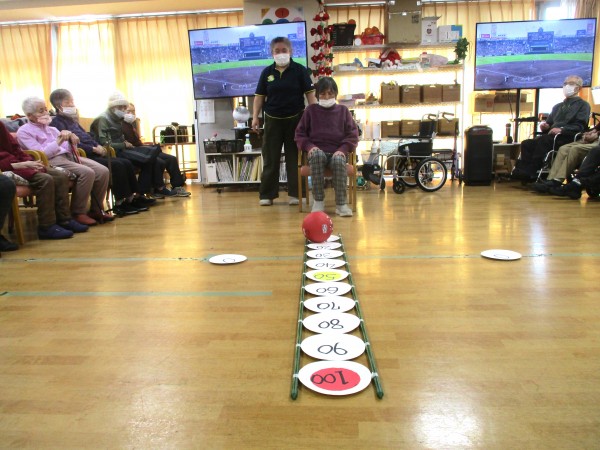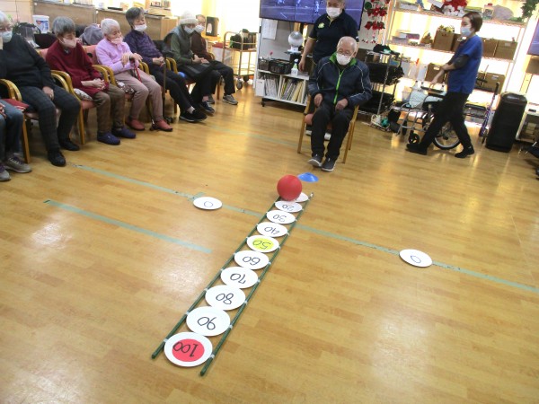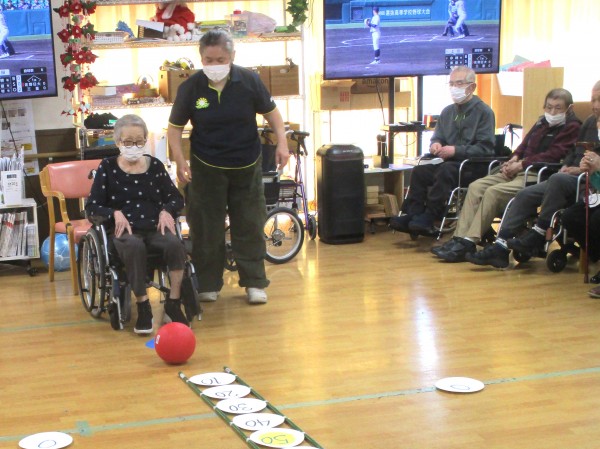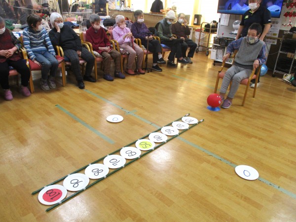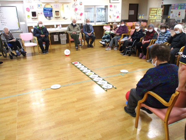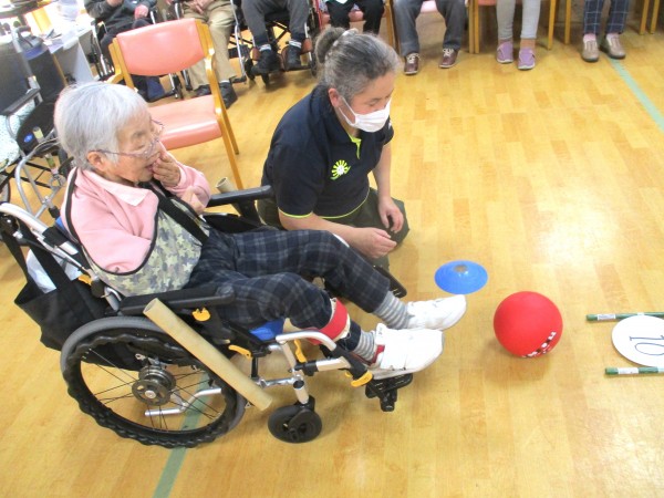 力加減や方向を考えながら行うことで、下肢の運動だけでなく脳の活性化にもつながります。自然と応援の声も飛び交い、笑顔あふれる楽しい時間となりました。これからも、わくわくしながら楽しめるレクリエーションをお届けしてまいります。