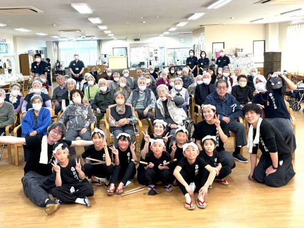 会場には力強い太鼓の音が響き渡り、利用者の皆さまも自然と手拍子をされたり、体を揺らされたりと、思い思いに楽しまれていました。小さなお子様から大人の方まで、息の合った迫力ある演奏に、会場は大盛り上がりでした。