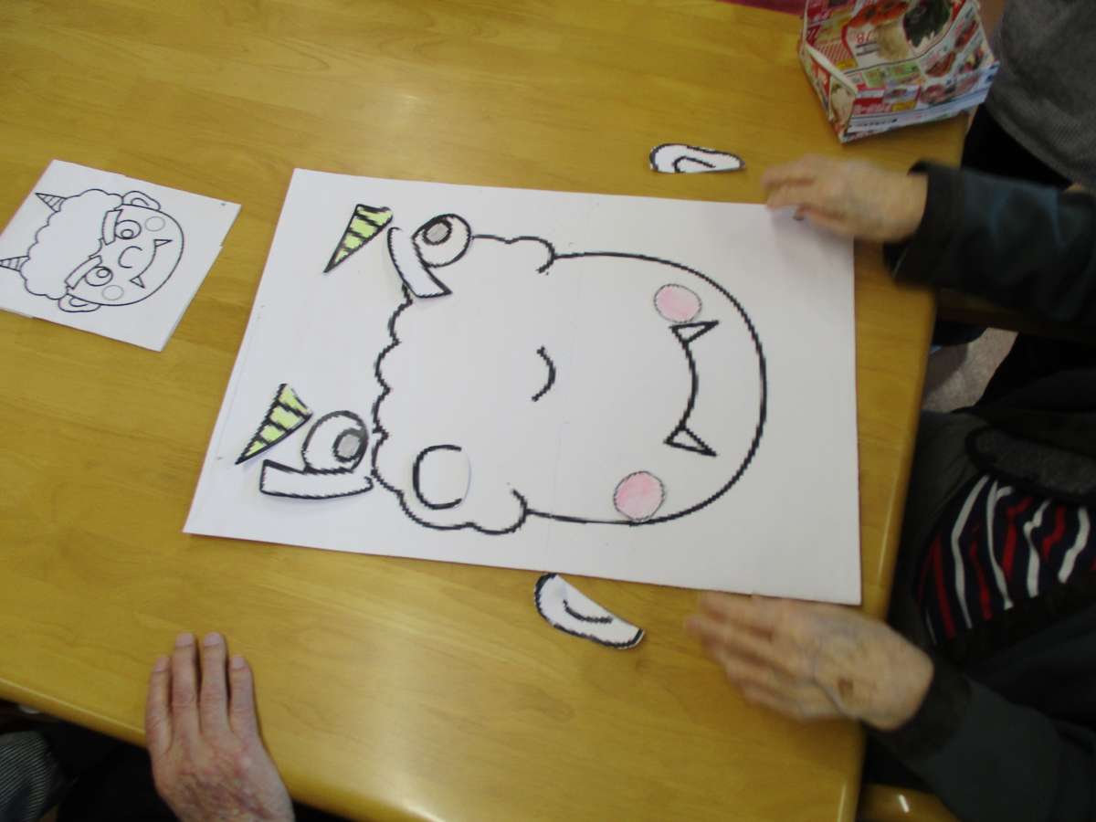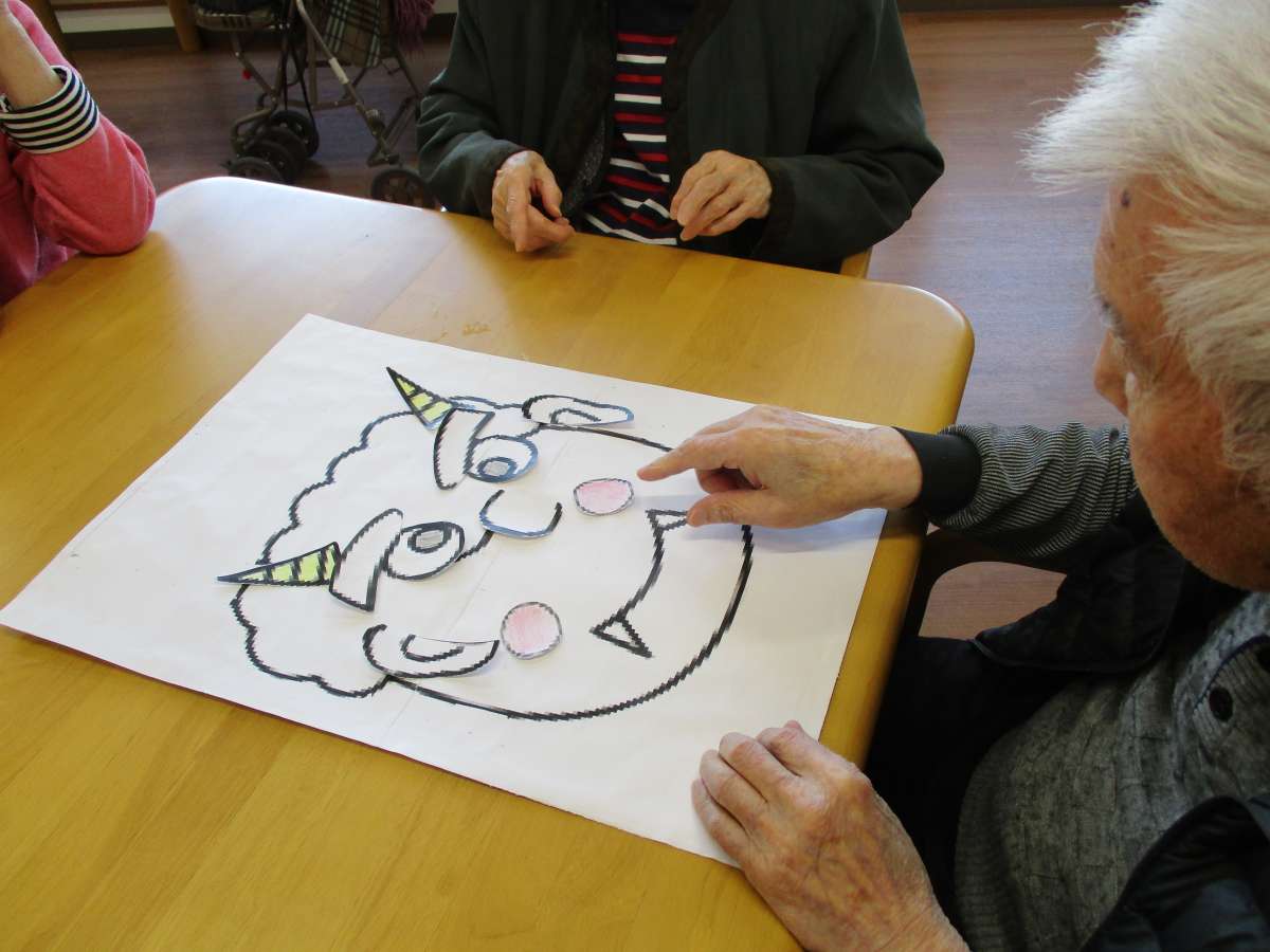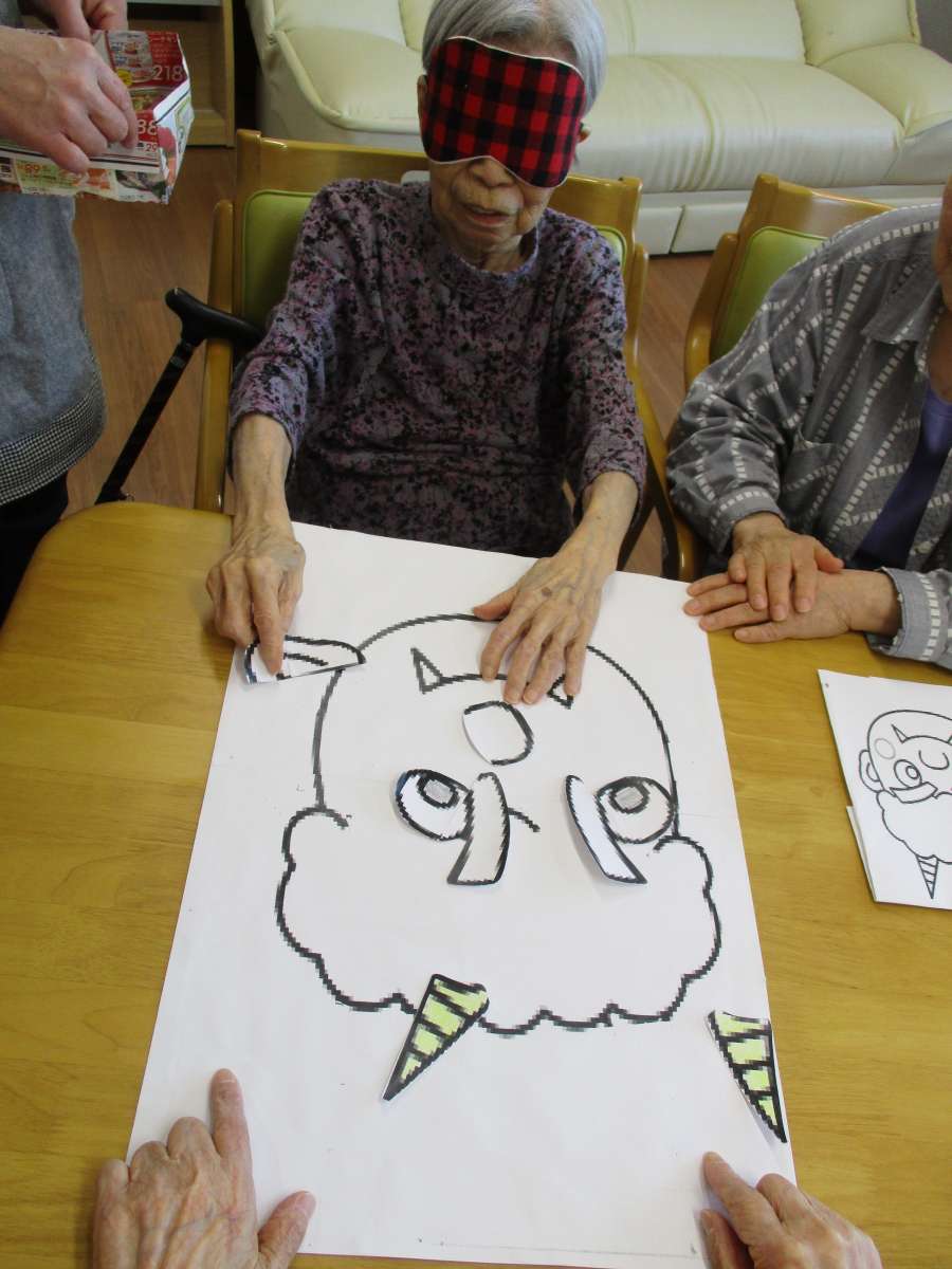 こちらは鬼の福笑いです。見えない中で顔を作るのは結構大変・・・。