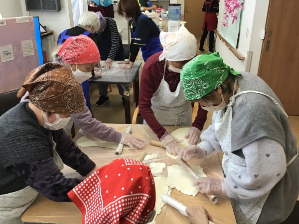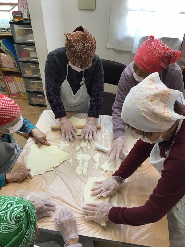 生地を捏ねるために利用者様皆様に生地を踏んでいただきました!