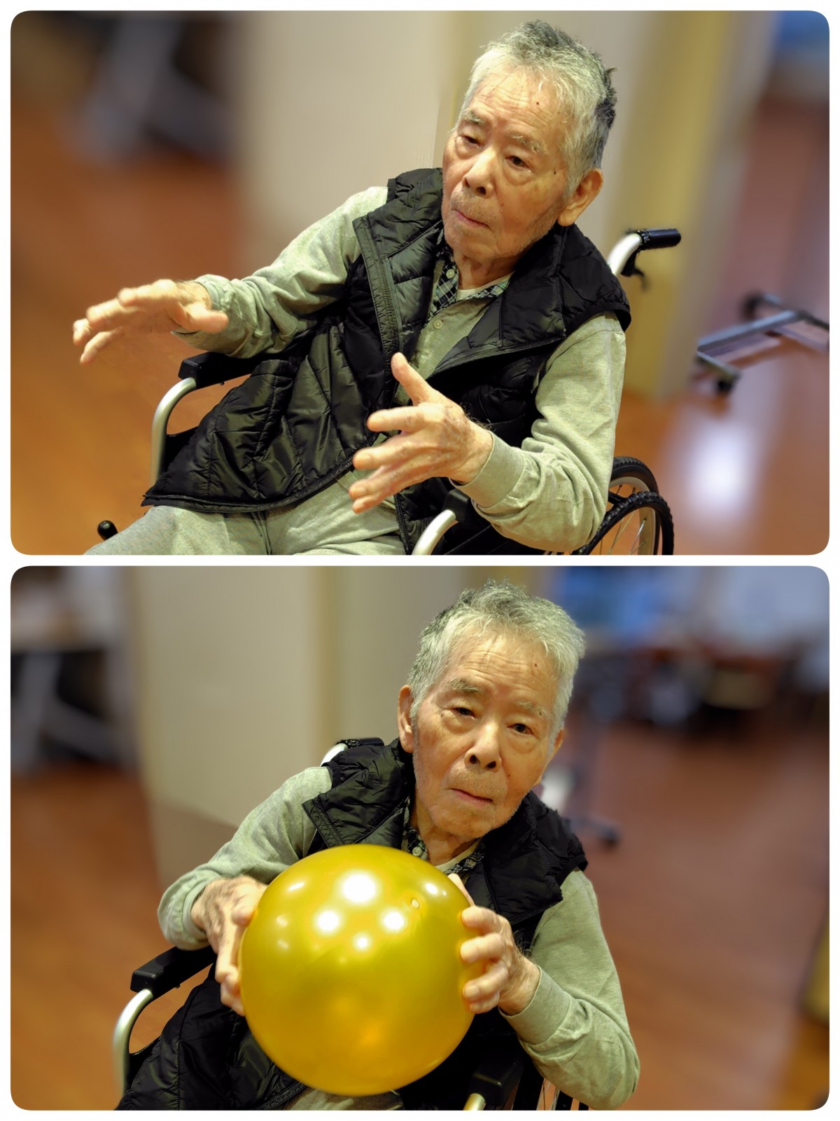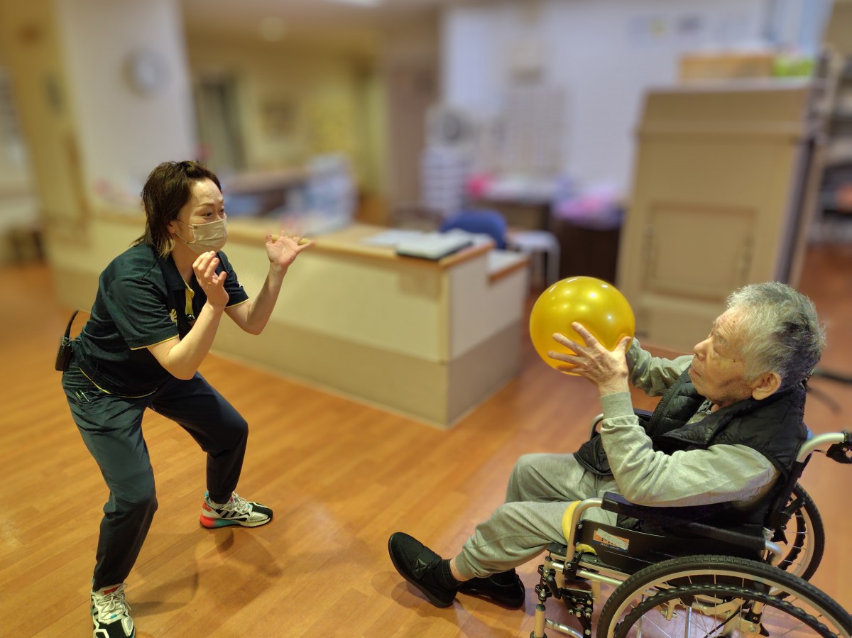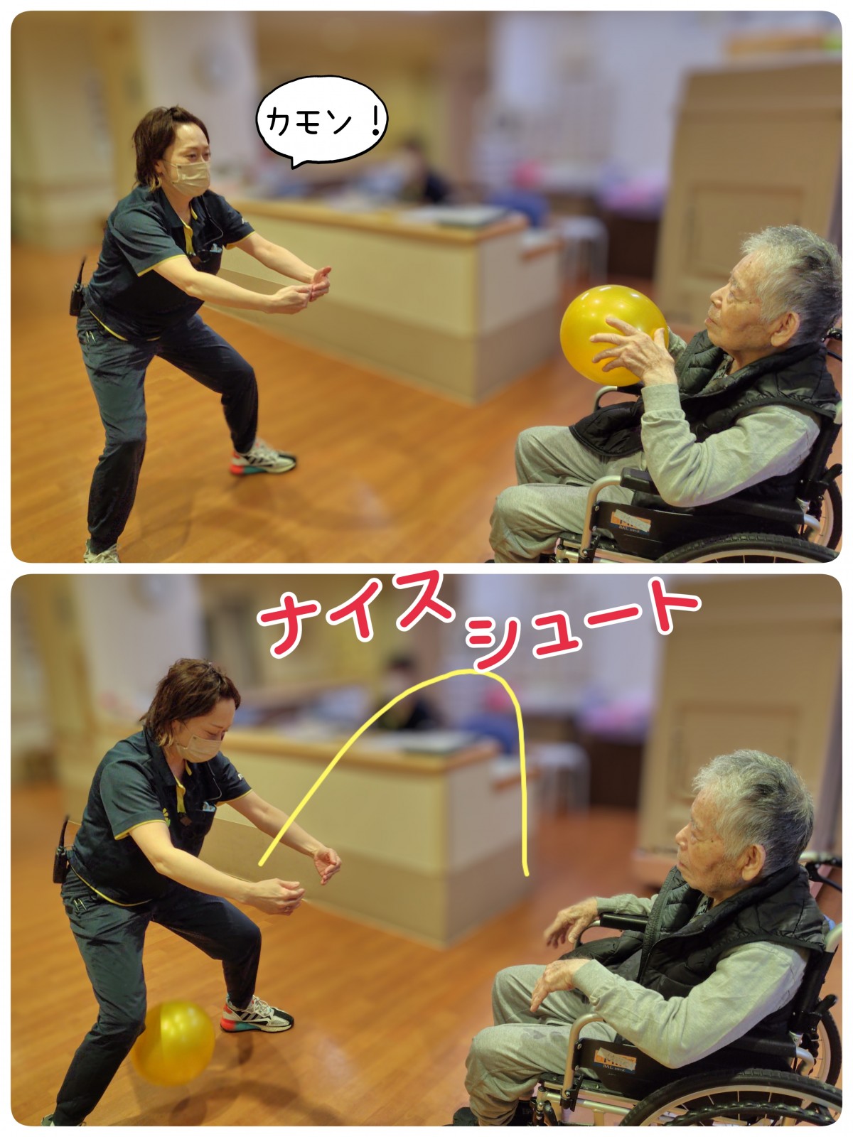 食後の運動!お部屋に戻られる前に、石塚ケアスタッフが『ヘイ!パス!』