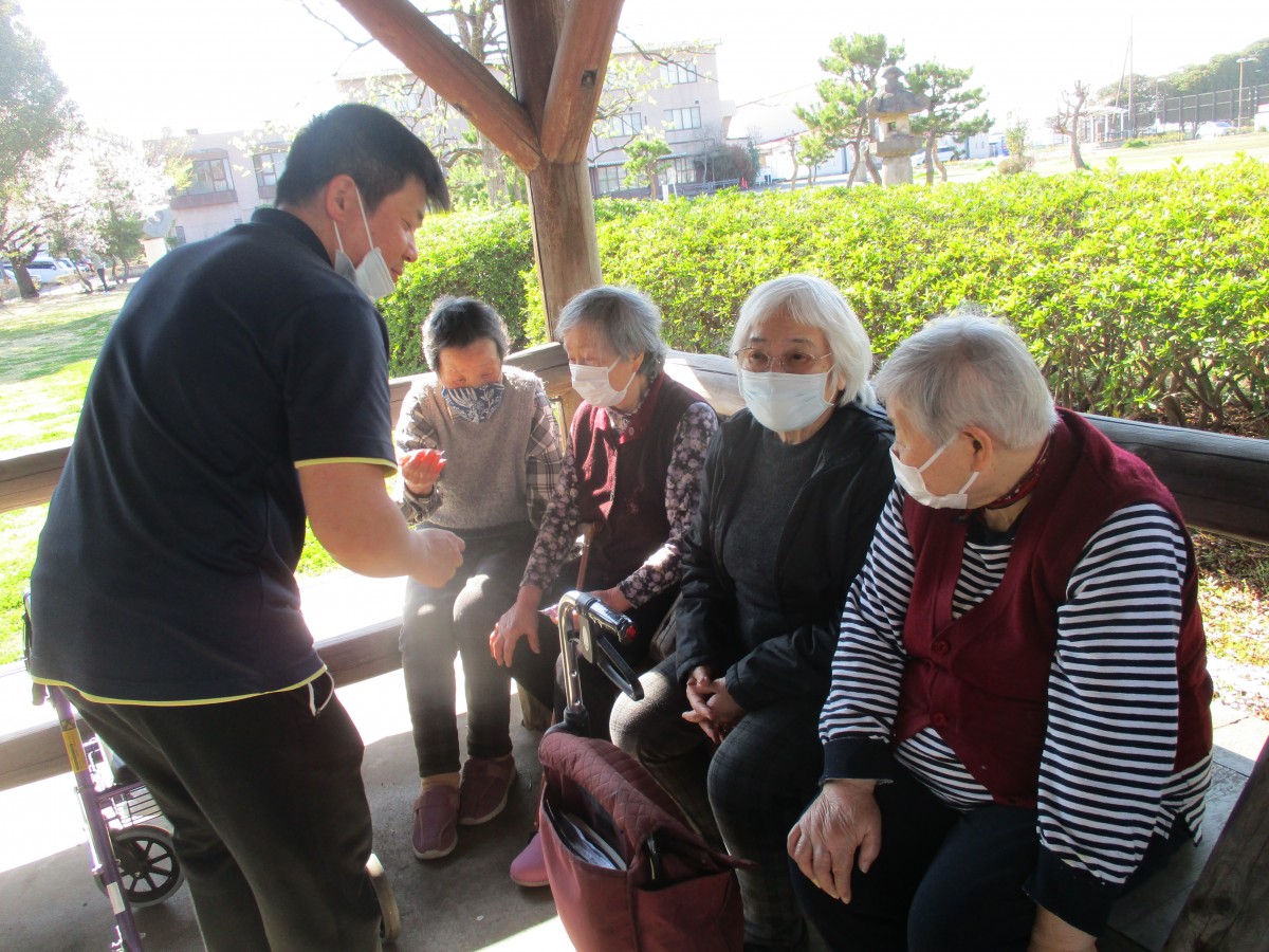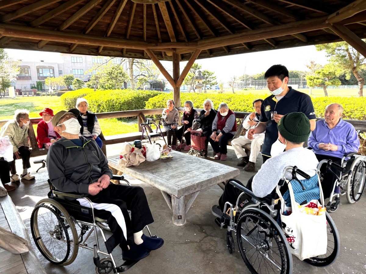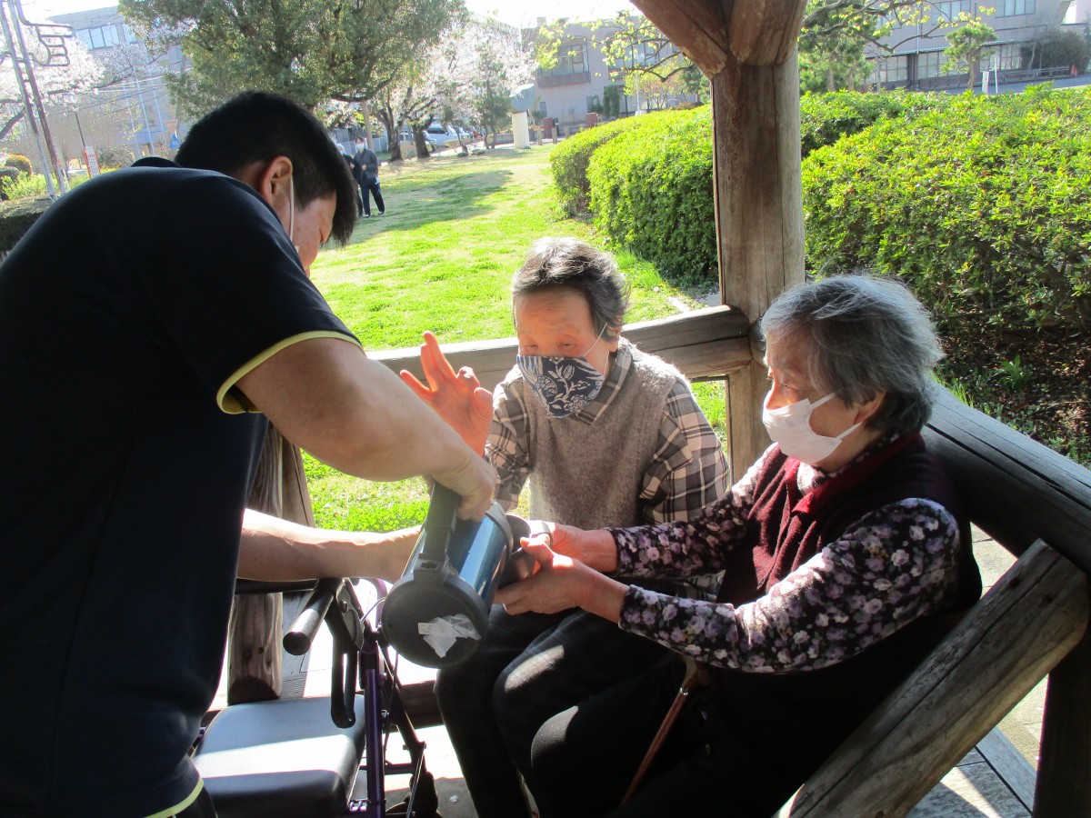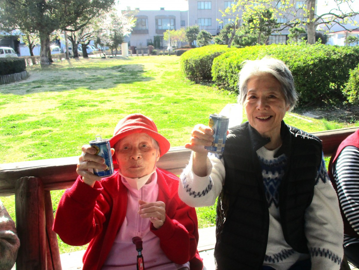 そこで急遽、職員が自動販売機へ。誤嚥予防の観点からも安全に楽しんでいただけるよう、人数分のお飲み物を購入しました。すると皆様、久しぶりの缶コーヒーに大喜び!「乾杯!」と何度も声を合わせながら、笑顔いっぱいのひとときとなりました。そんなハプニングもありましたが、「今日のお花見は最高だね!」と嬉しいお言葉もいただき、思い出に残る外出レクリエーションとなりました。