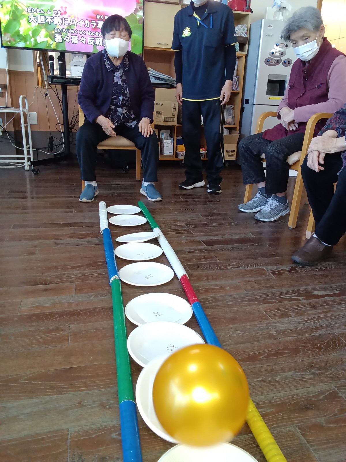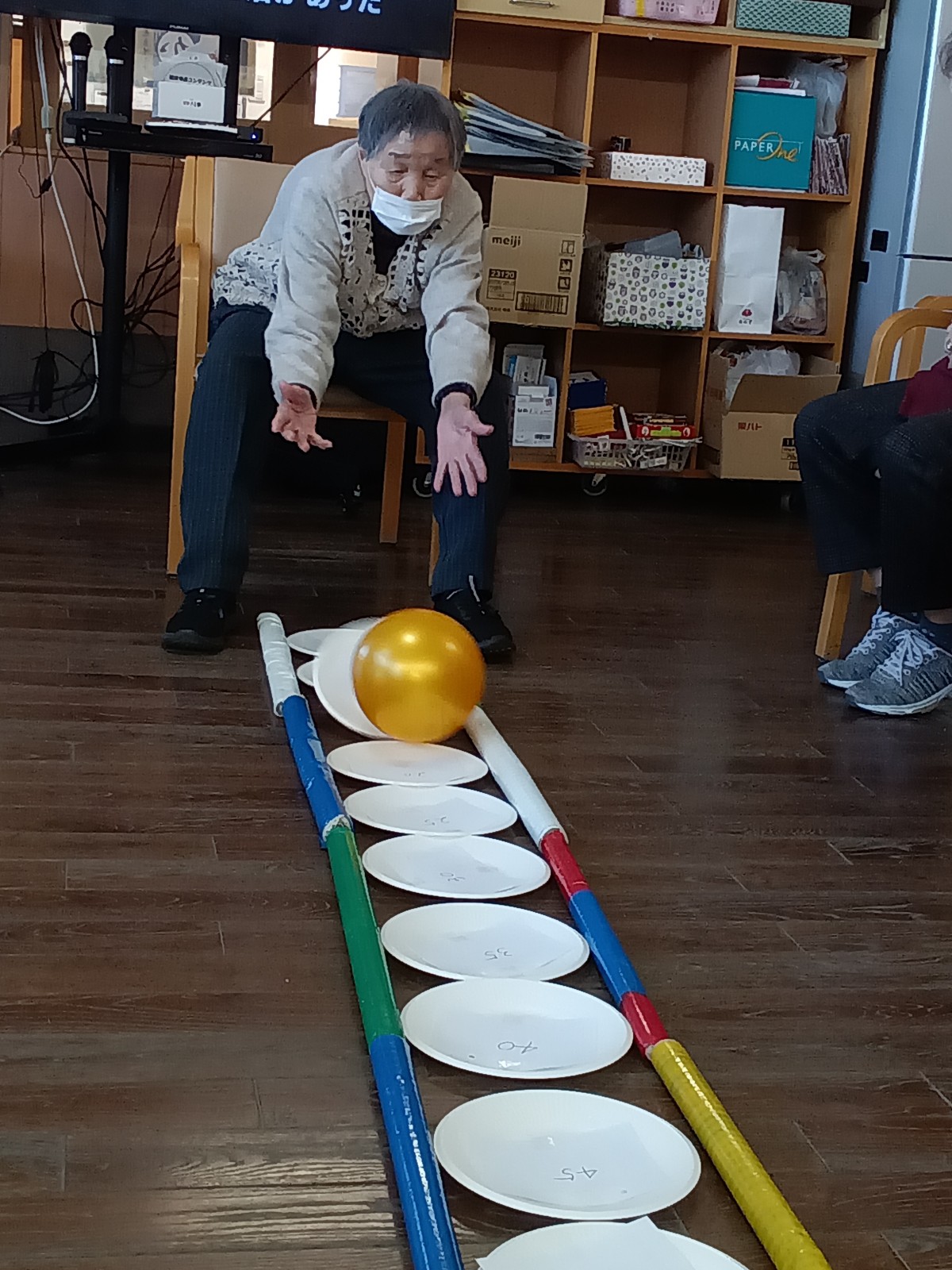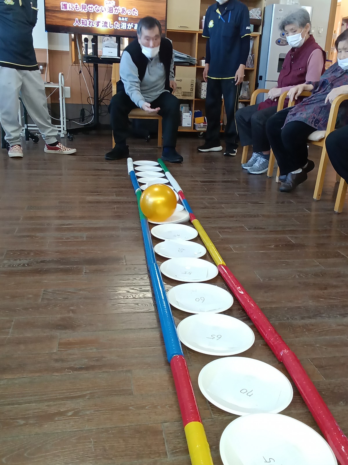 紙皿の上に点数を貼り付けてボールが止まった所の点数を獲得すると言ったものになります。