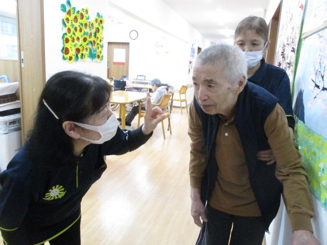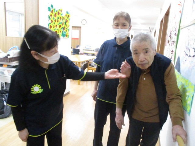 日々のご様子です!! 室内を職員と一緒に歩かれています( ^ω^)・・・ 支えられて嬉しそうですね(^0_0^)
