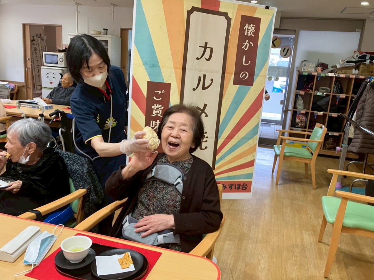 早速、焼きたてのカルメ焼きを利用者の皆さんに食べて頂き、「懐かし〜」 「甘〜い」と言ったお声が沢山聞こえ、喜んで頂けてスタッフ一同嬉しい限りです(*^▽^*)