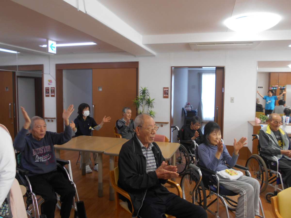 座って出来る運動をしたりリズムに合わせて手を叩いて運動しました。