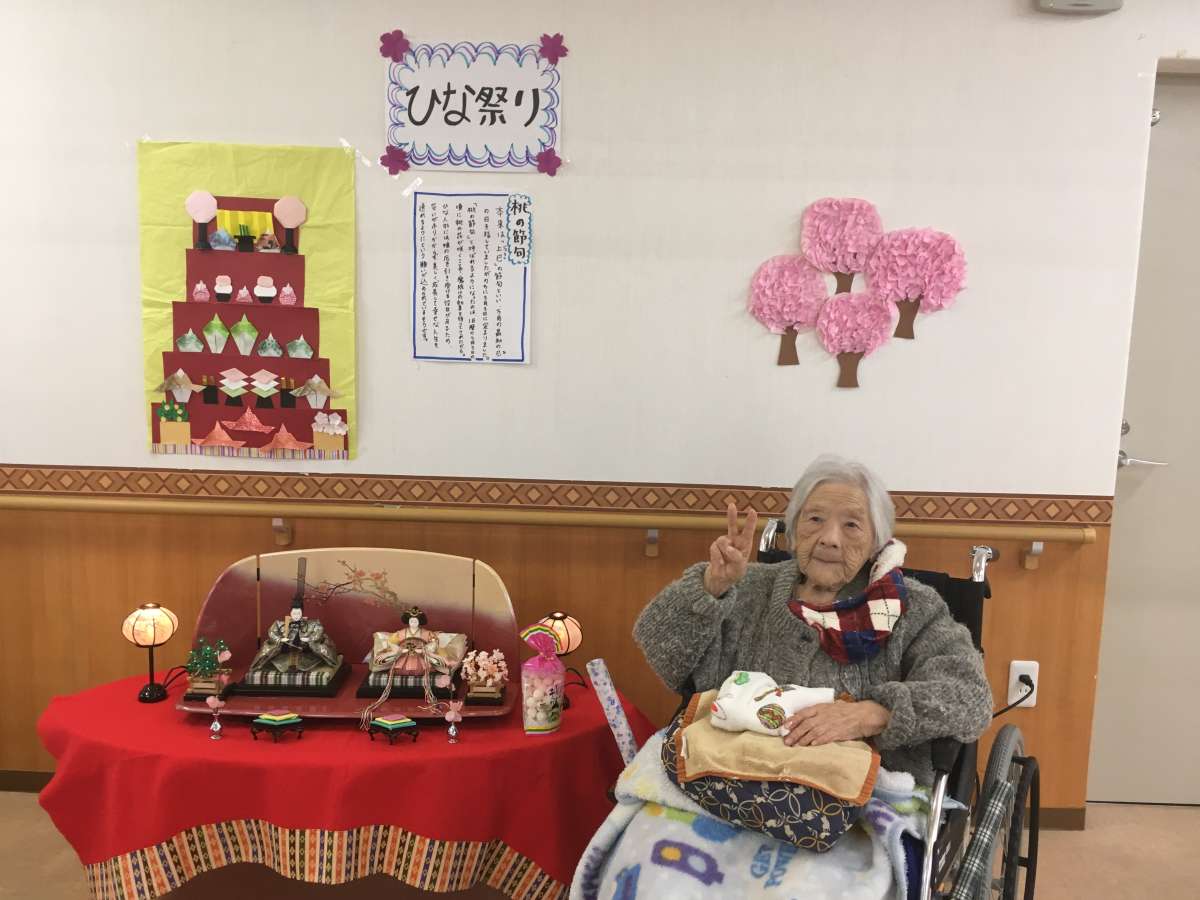 施設で飾っているお雛様とご利用者様で写真を撮りました☆