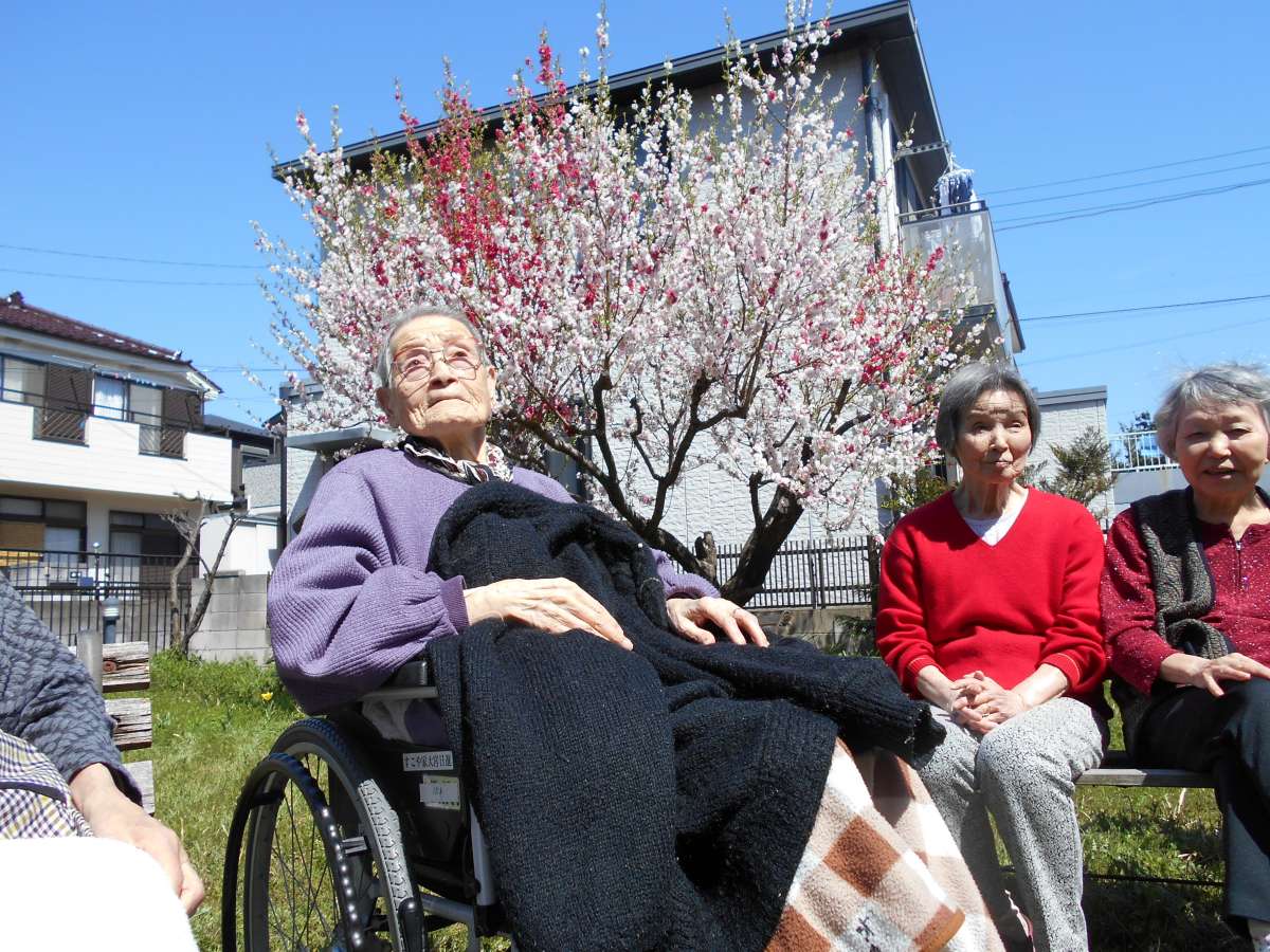 介護付有料老人ホームすこや家大宮日進の自慢の庭に咲く花や木々に魅了され、春の暖かい日差しの中、ご利用者様と日向ぼっこ。