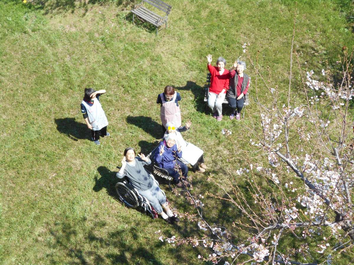 「ちょっと外に出てみない」と声が掛かれば、各階からひとり、またひとりとご利用者様が集まって来ます。