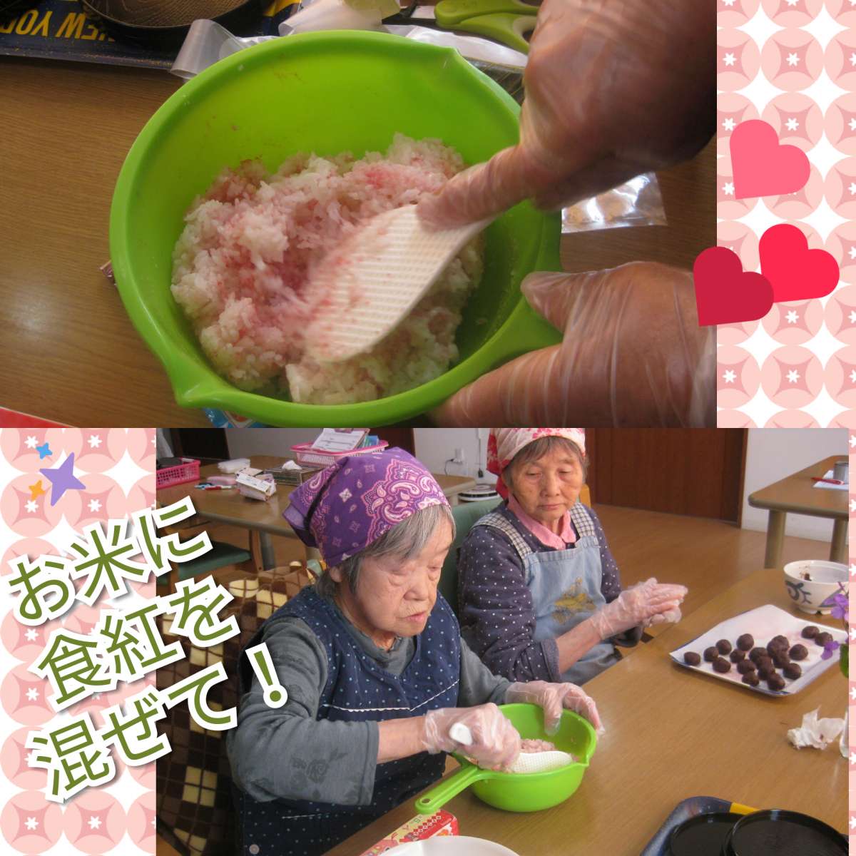 続いて、炊けたお米に食紅で色を付けます!