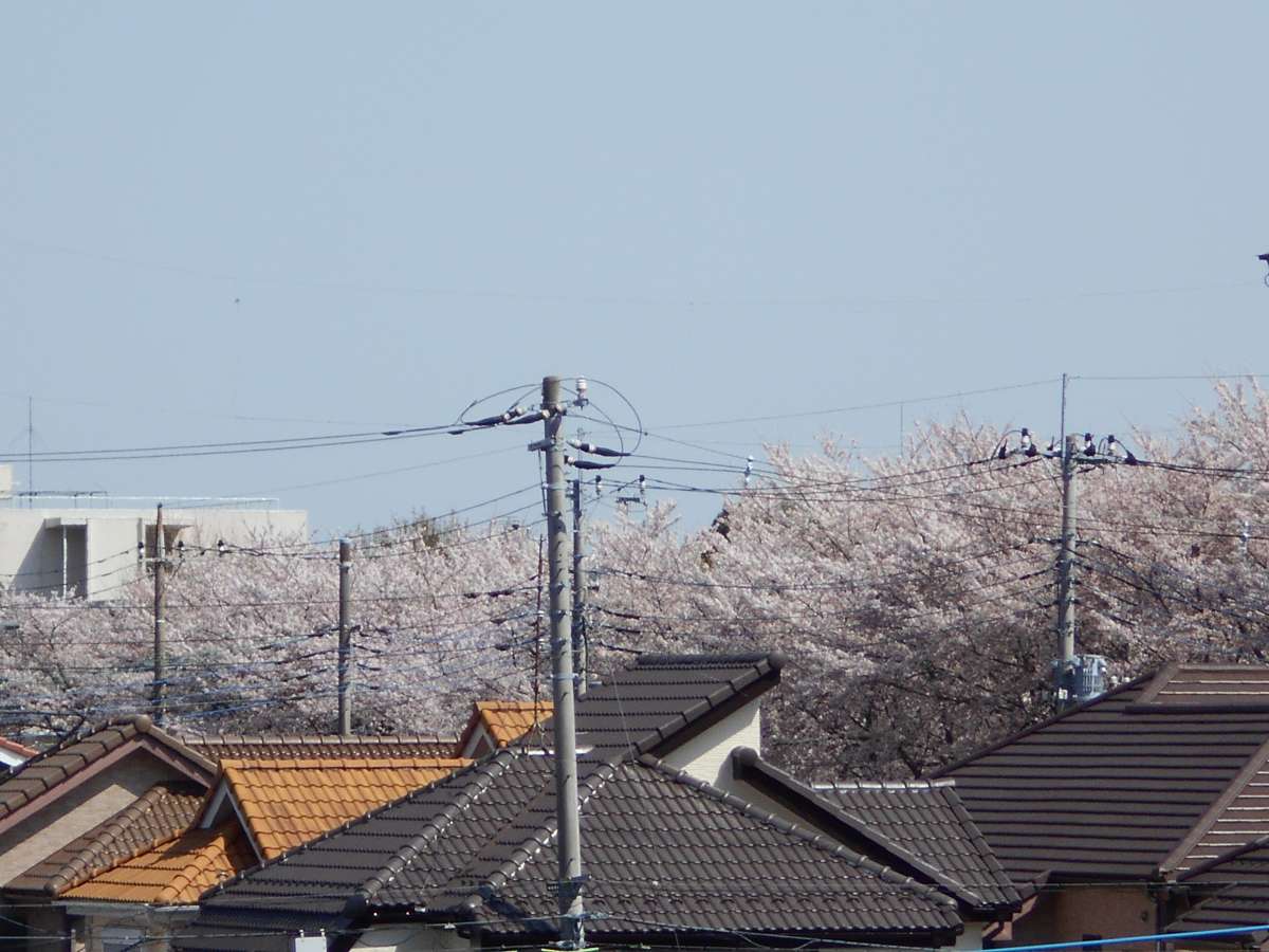 屋上からも、陸上自衛隊大宮駐屯地の桜並木(屋根越しの桜の写真)がよく見えますが、目を下に向けると、お花見をしているご利用者様を桜越しに発見。