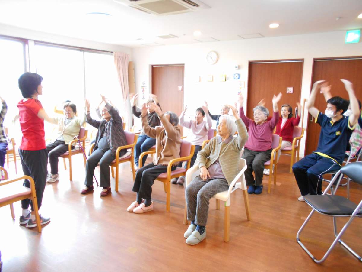 次に数を数えながら足踏みなどをした後、皆様の体調をみながら音楽に合わせて体を動かしました。