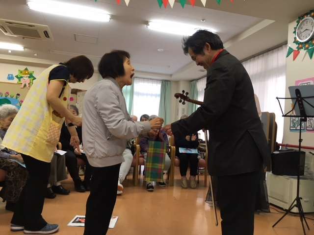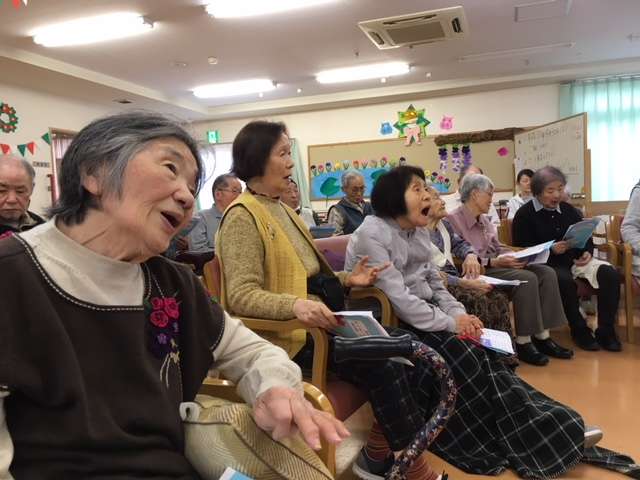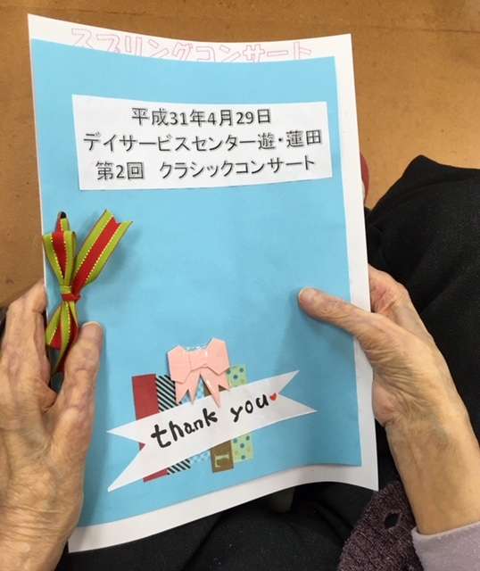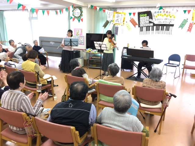 参加した皆様も一緒に歌う箇所があり、デイサービスのフロアに一体感が生まれてとても楽しい演奏会となりました。