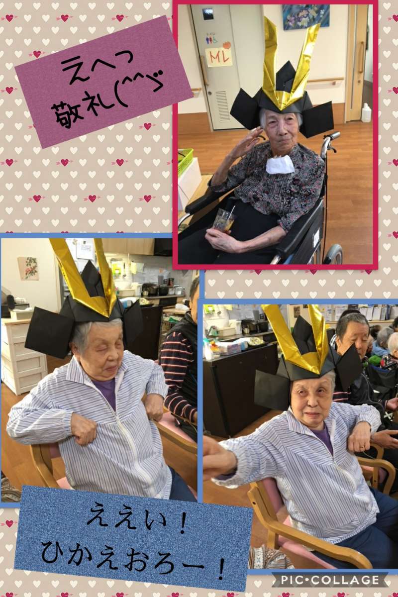 まずは、折り紙博士でお馴染みの山根職員による兜をかぶり、記念撮影!
