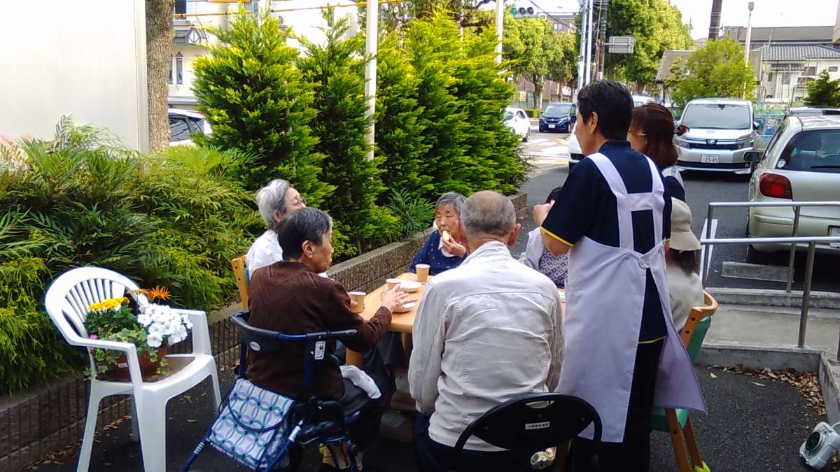 施設の中や、お散歩で行った公園等でおやつを食べたり、お茶をすることはありましたが、施設の前の駐車場でテーブルと椅子を持ってきて、みなさんで初めての場所でお茶を飲むのもいいですね(*^_^*)