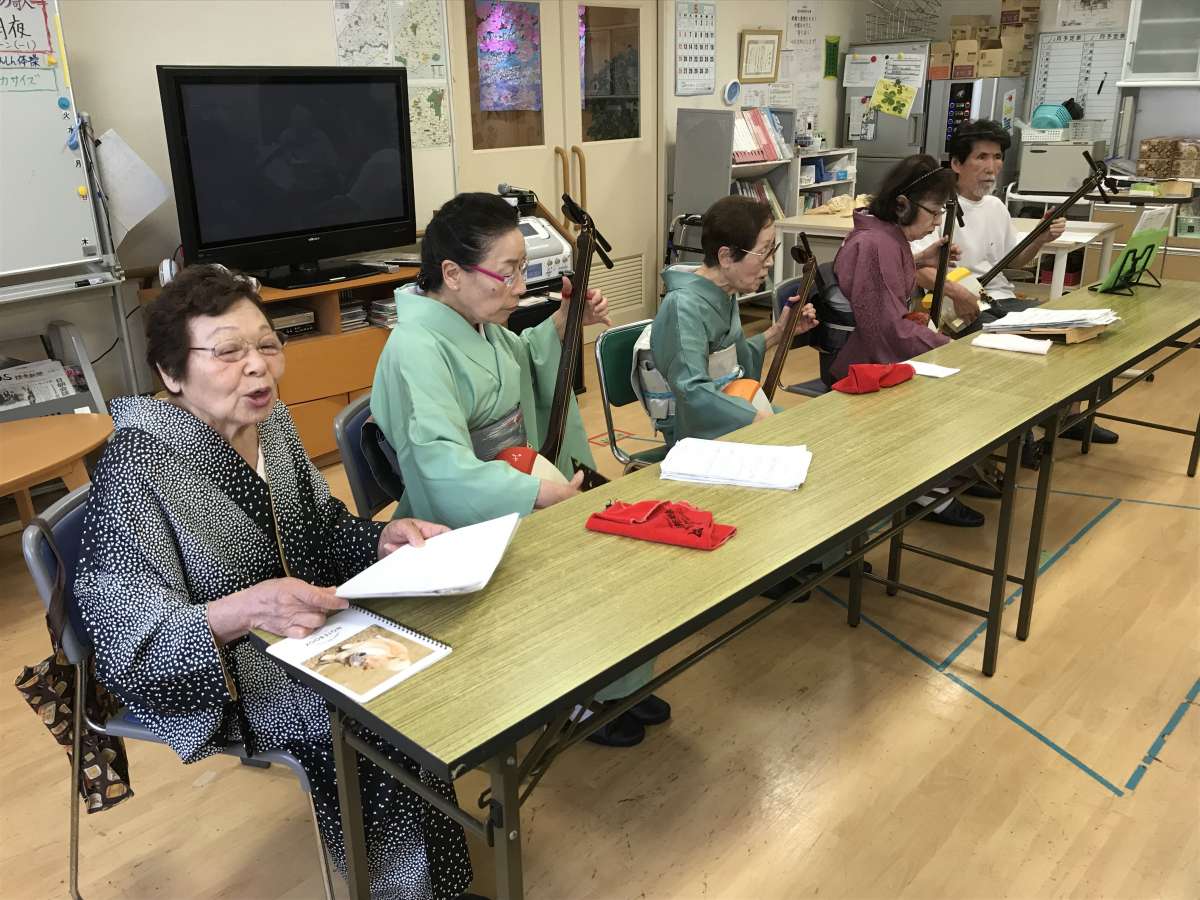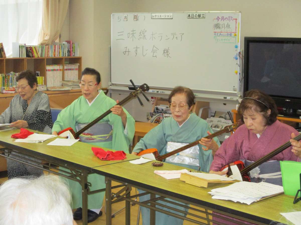 「三味線ボランテイア みすじ会」の5名の皆さまが来所くださり、民謡や演歌など約15曲を演奏して