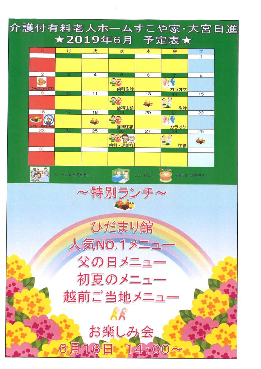 介護付有料老人ホームすこや家大宮日進の6月のイベントカレンダーが完成しました。