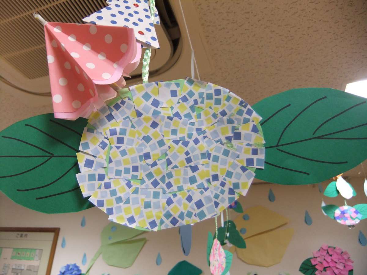 ご利用者様が折り紙で貼っくださったアジサイのお花沢山咲いています。