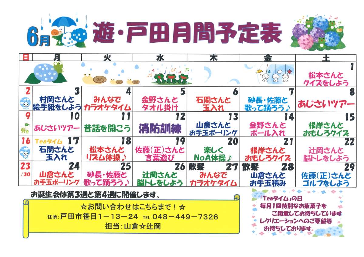 こんにちは!!デイサービスセンター遊★戸田です!!遅くなってしまいましたが、6月のレクリエーションの予定です!!
