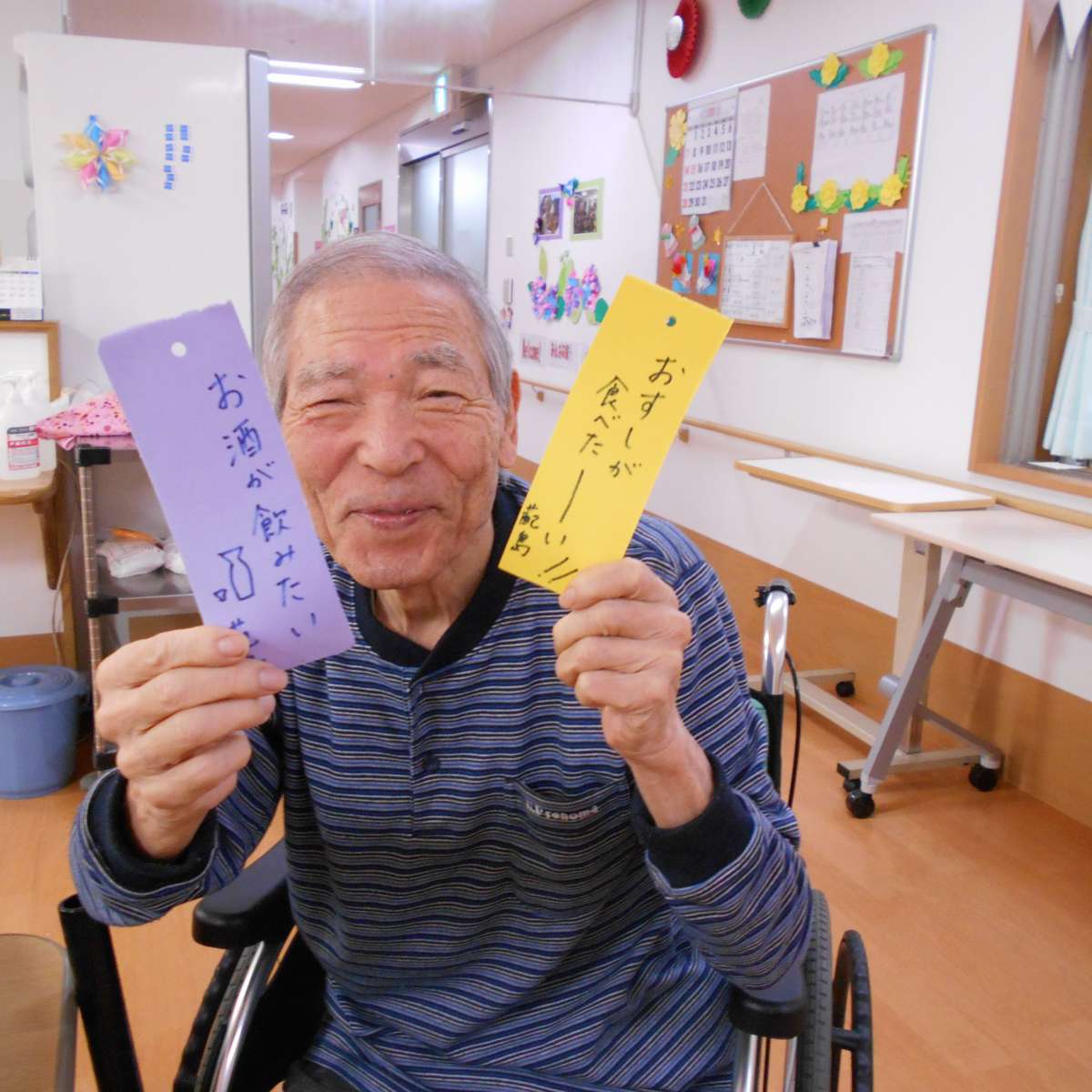 などの会話が飛び交っていました。 飾りつけをしていると、ご家族の方が見え一緒に書いた短冊を見て 『これ俺が書いたんだよ(^^)v』と楽しそうでした♪ 皆が書いた短冊や飾りを見映えよく飾ってくださるK様! みんなの願いが叶いますように(^人^)