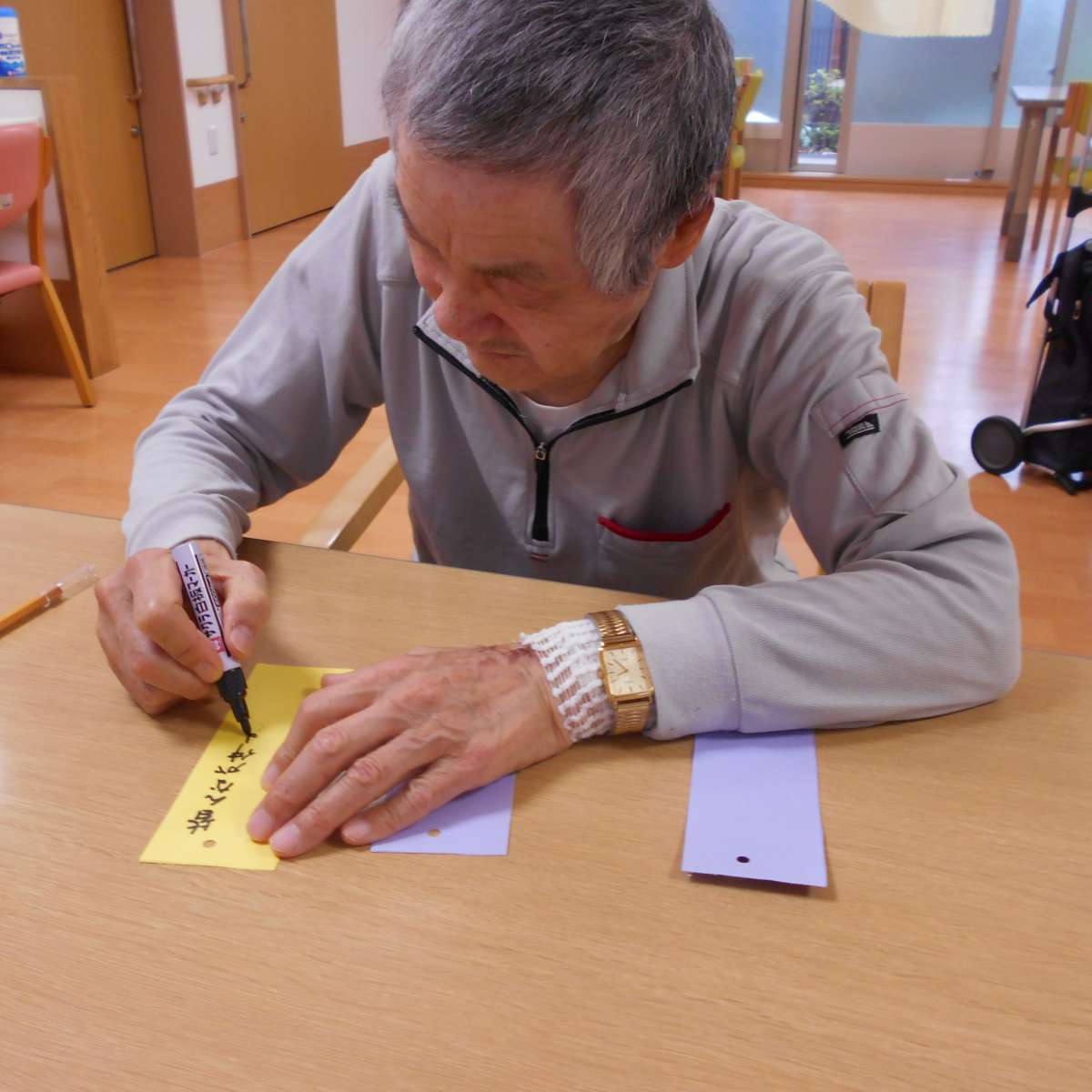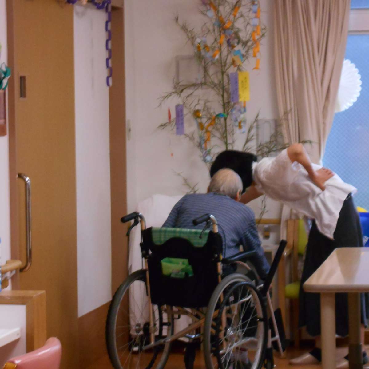 こんにちは~内野本郷のツクイです(^○^) 今日7月4日1階では施設長が、頂いてきた大きな笹に七夕の飾りつけを行いました♪ 『どこにどう飾るの?』 『何て書こう』