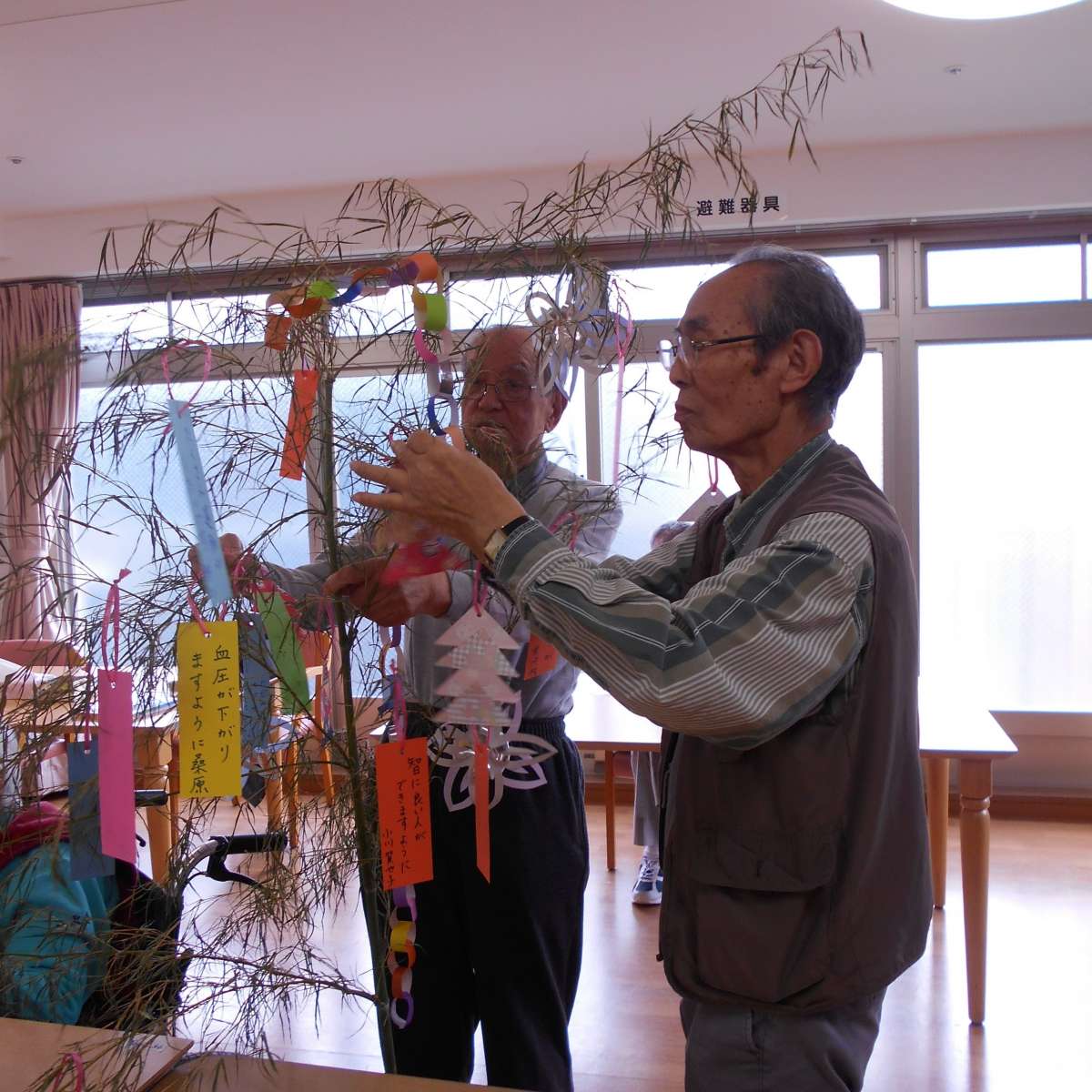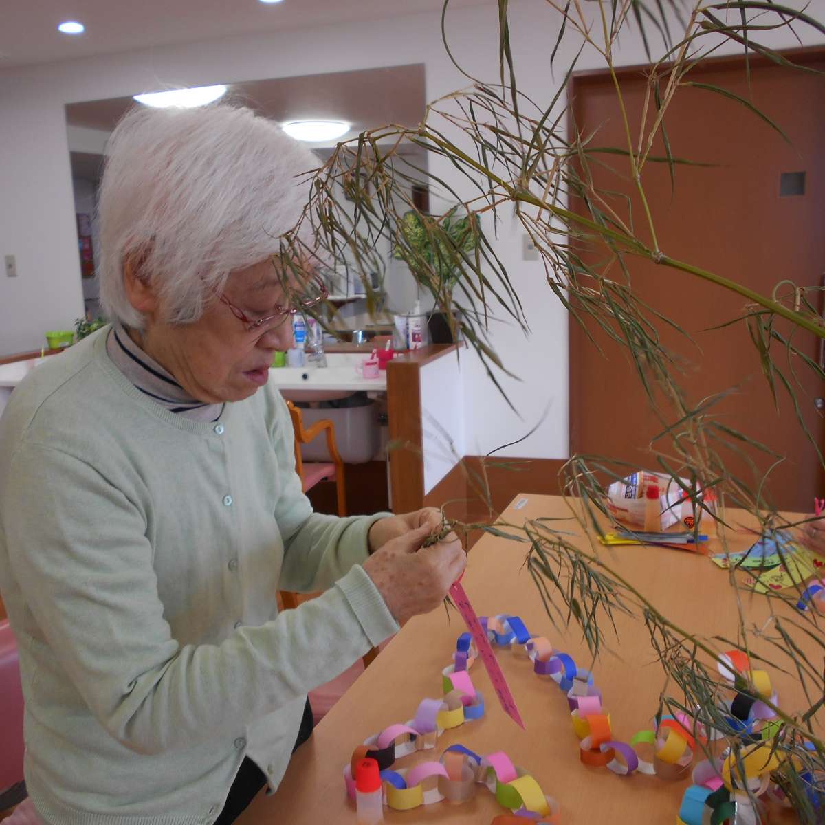 こんにちは内野本郷のツクイです(^○^) 今日は2階の七夕の制作作りと飾りつけを頑張りました! わっかを作りながら 色分けしてくださる方 「小さい時よく作ったよね」 「ここに使ってない色ない?」 と話ながら手先を使いました(^.^) 飾りつけを、する時も、皆さんで助け合って、つける物を渡したり、持ってあげたりしていました(*^^*) みなさん願い事が、たくさんあるみたいで短冊が多かったです(笑)