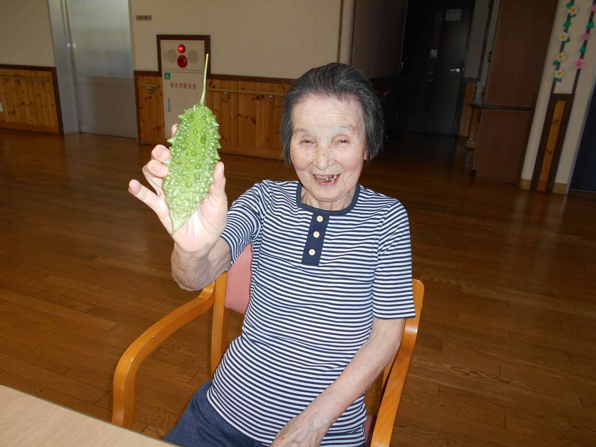 介護付有料老人ホームすこや家大宮日進の癒しの緑のカーテンから、見事に育ったゴーヤを収穫してみました。