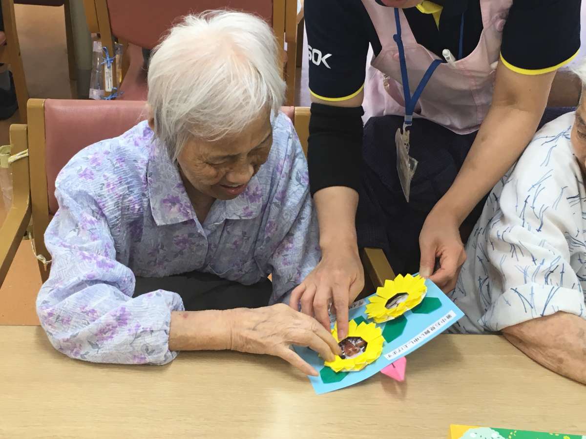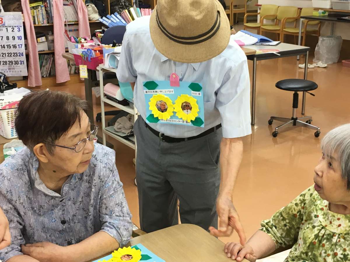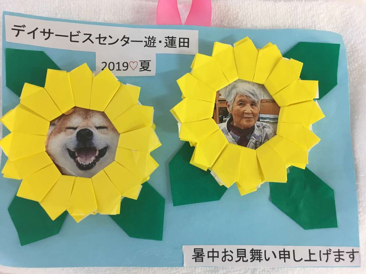 下の写真を見ての通り、ご利用者様とワンちゃんの写真をペアにし、そこにお手製のヒマワリの中に入れております。