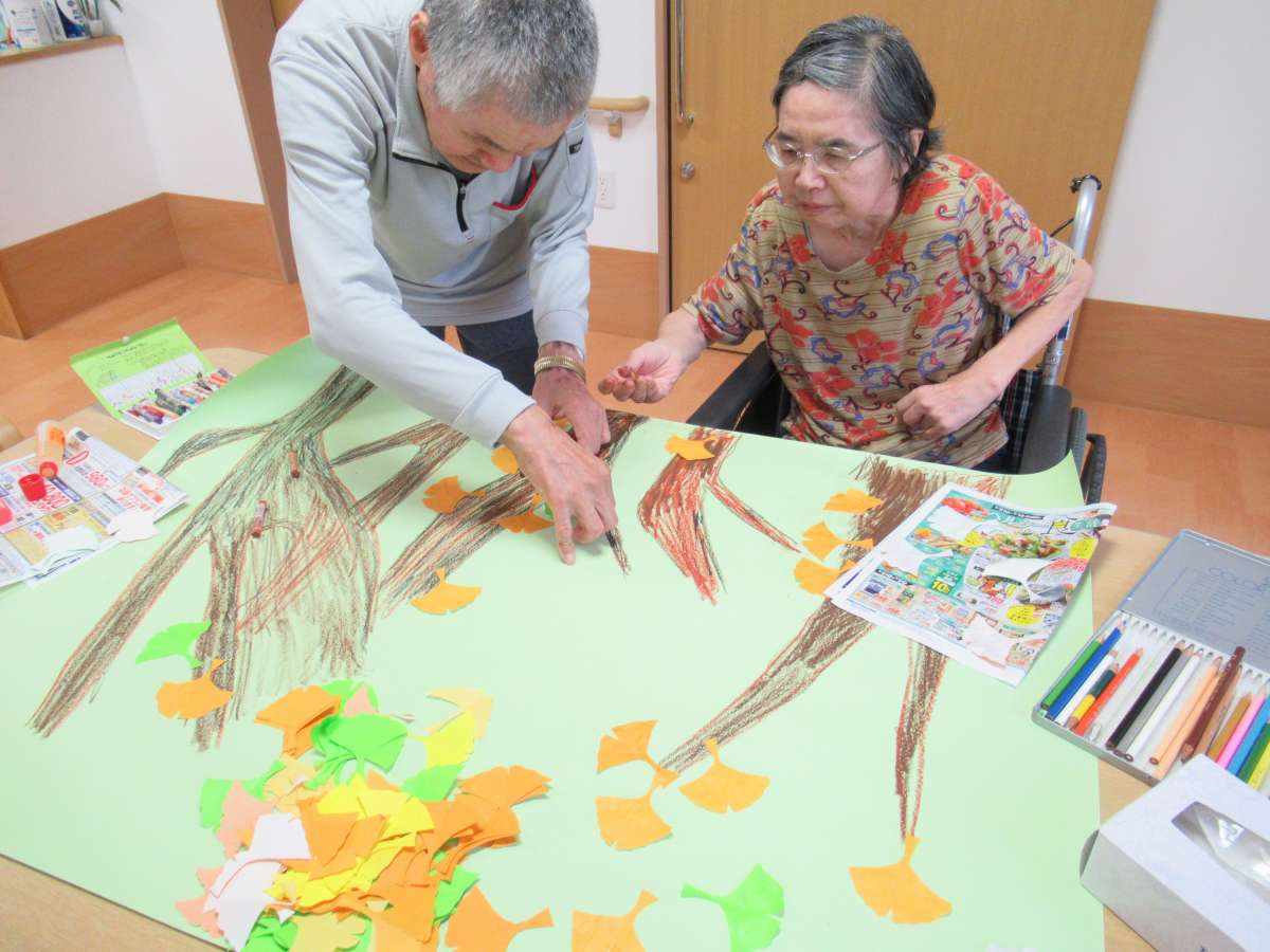 こんにちは、みんなの家・大宮内野本郷です(^ー^) 今日1階では入居者様と一緒に、(いちょう)を作りました(^^) 模造紙に好きな大きさの木を書いてクレヨンで塗り 折り紙で切った、いちょうをペタペタ! 秋の景色が綺麗に出来上がりましたね(^ー^)