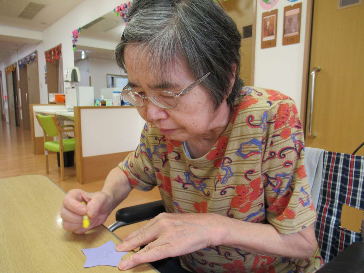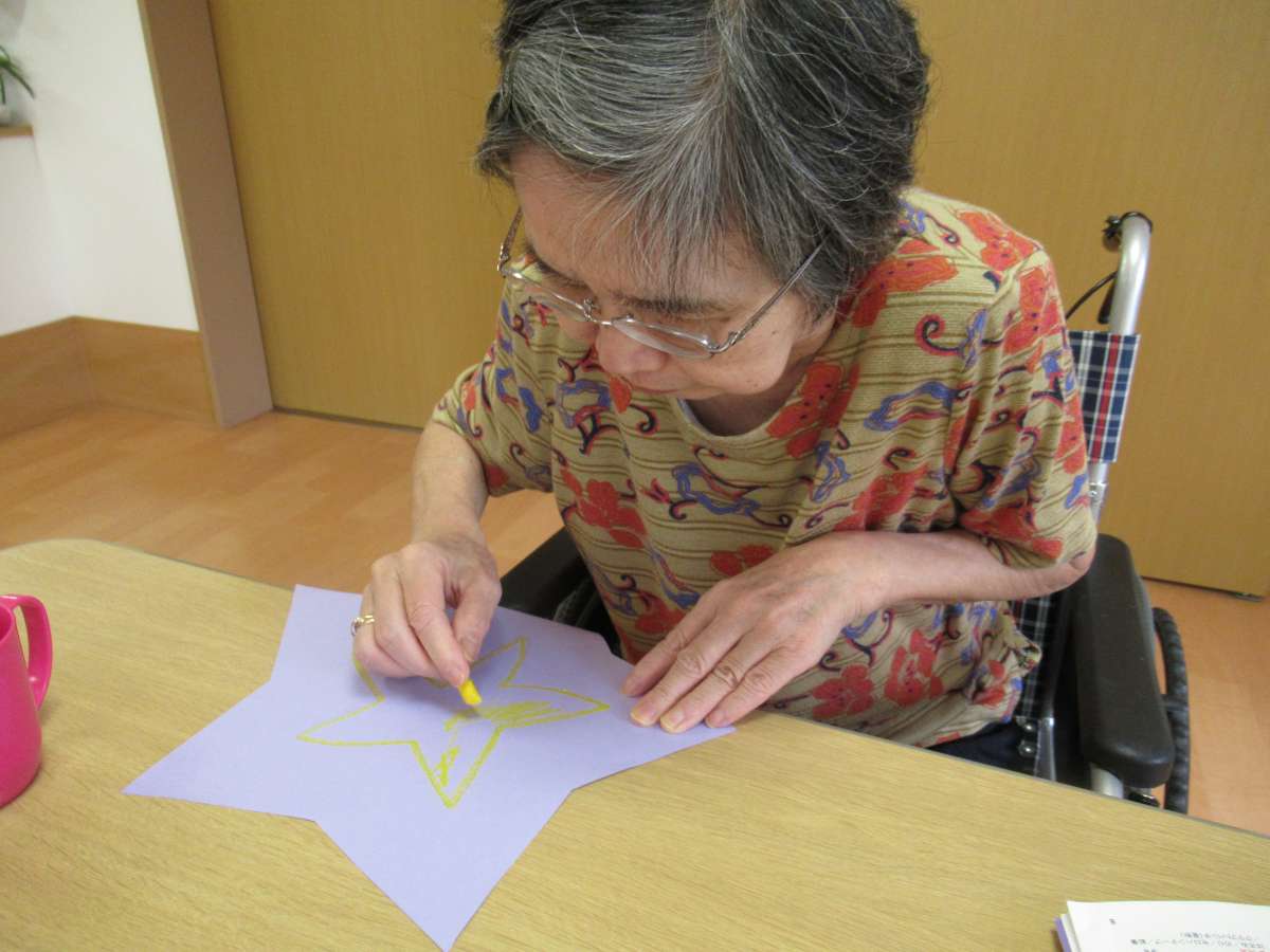 お月見の中にウサギを貼り桔梗の花の中を器用に塗りつぶし飾りつけをしていただきました♥