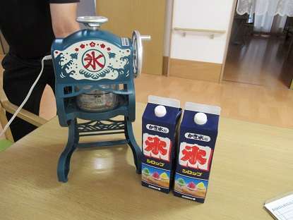 1階の利用者様と一緒に利用者様全員に行き渡る様にかき氷を作りましたが、数が多い為なかなか重労働でした(電動で助かりました)