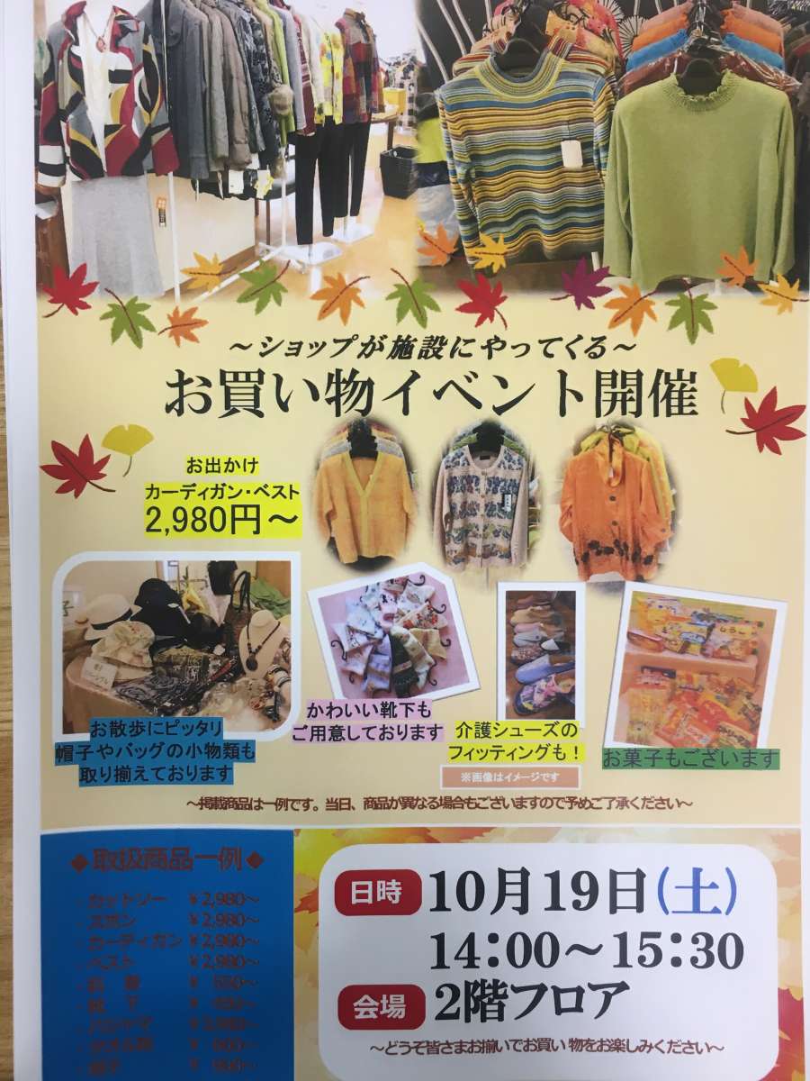 10月19日にはお買いものイベントを開催します!普段はなかなかお洋服などを選べない事から、皆様にお買いものを楽しんでいただこうという企画です!いっぱい買うぞー(●^o^●)