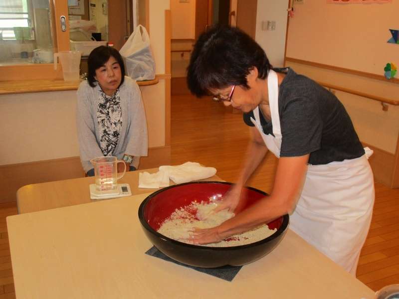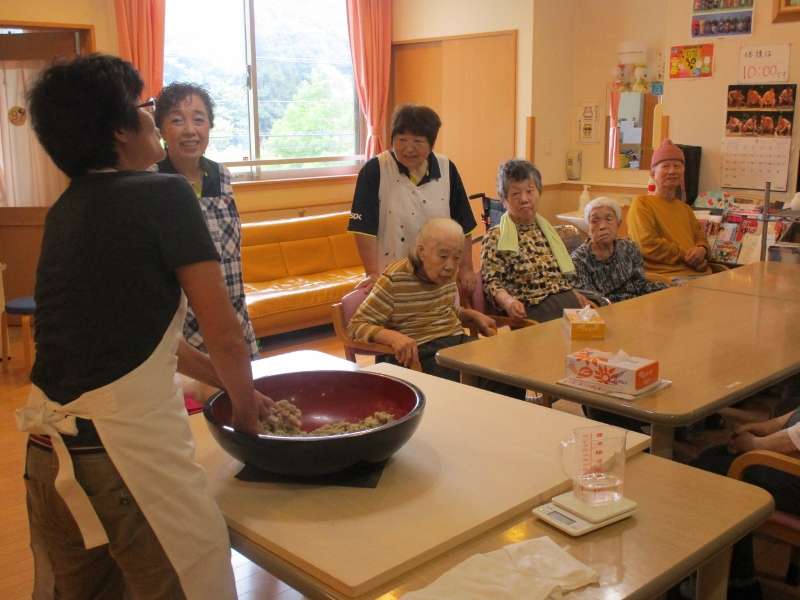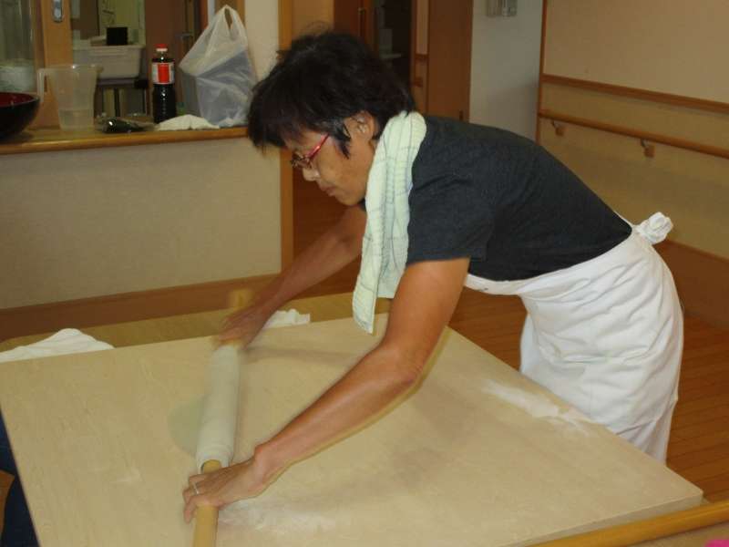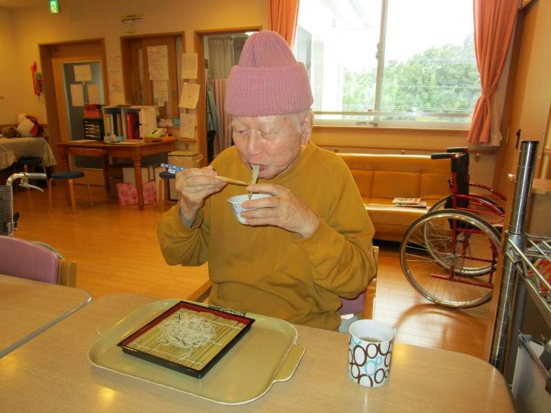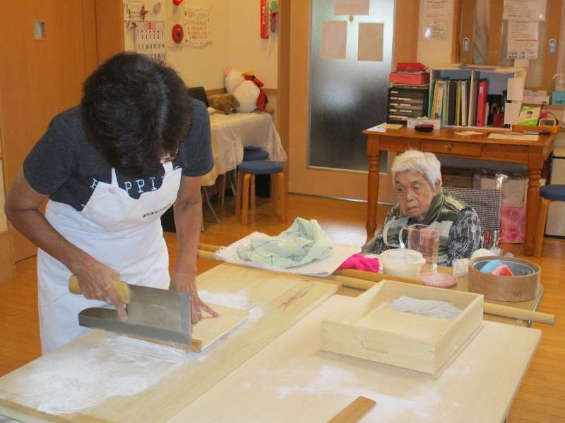 こんにちは! グループホームみんなの家・横浜宮沢2です(^^) お彼岸になり少しずつ過ごしやすくなってきましたね♪ グループホームみんなの家・横浜宮沢2では先日敬老会を行いました。 今年はフロア毎に行い、2階はボランティアさんに来ていただき「蕎麦打ち会」をしてもらいました。 本格的な蕎麦打ちに入居者様たちは興味津々で楽しそうに見学されています(^_^) できたてのお蕎麦は1分ほどで茹で上がり、皆様口々に「おいしいねぇ~」とおっしゃり、おいしそうに召し上がりました(о´∀`о)