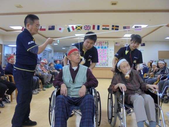 棒を使って隣のご利用者様に輪投げの輪を送っていきました。