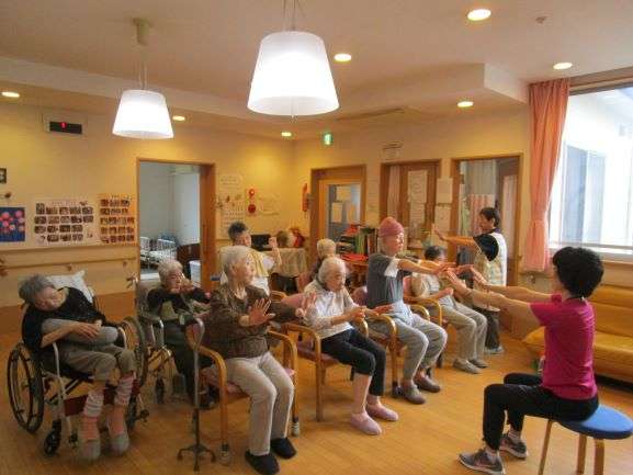 皆様こんにちは。 グループホームみんなの家・横浜宮沢2です。 先日 ALSOK健康増進プログラムの「いきいきリズム体操」が行われました。 講師の方の指導のもと、音楽に合わせて体を動かします。 手を上げたり体をひねったり、汗ばむくらいでした。 普段の日課の体操よりも皆様張り切ってましたよ!( ´∀`)
