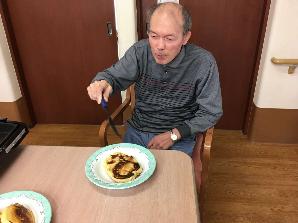 3時のおやつのホットケーキをIご利用者様とKご利用者様に焼いていただきました。